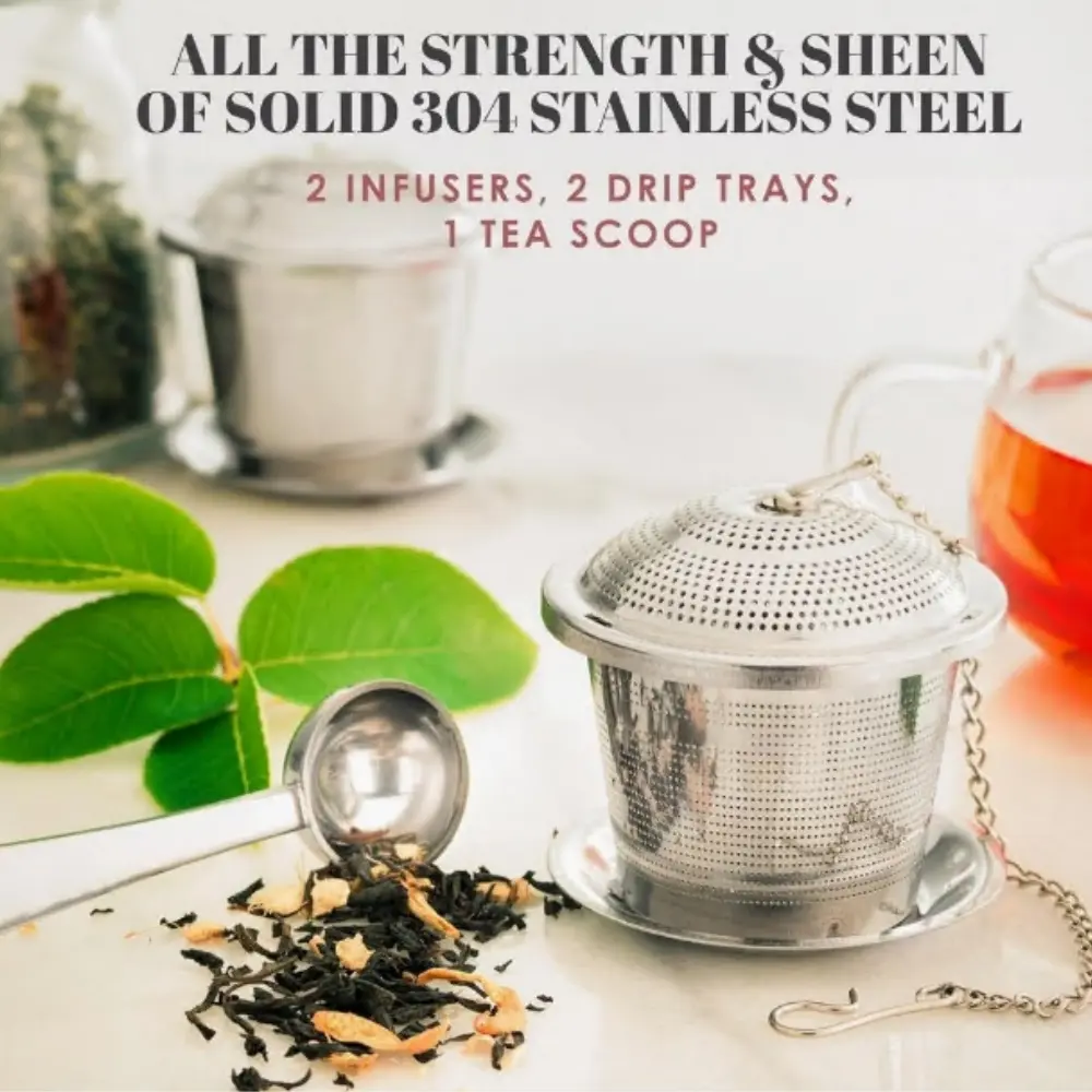 ·LARGE CAPACITY – MORE TEA FOR EVERYONE: Set includes 2 tea infusers, 2 drip trays and 1 tea scoop. Now you can brew tea for you and your beloved ones or a houseful of friends. Instant refreshment!