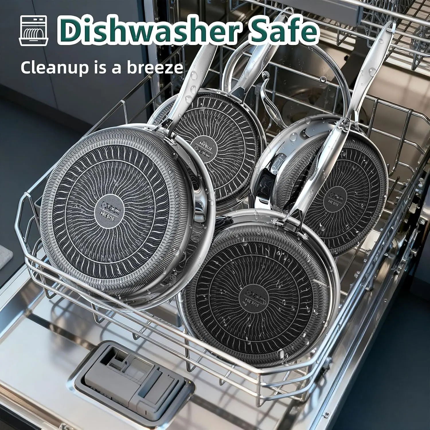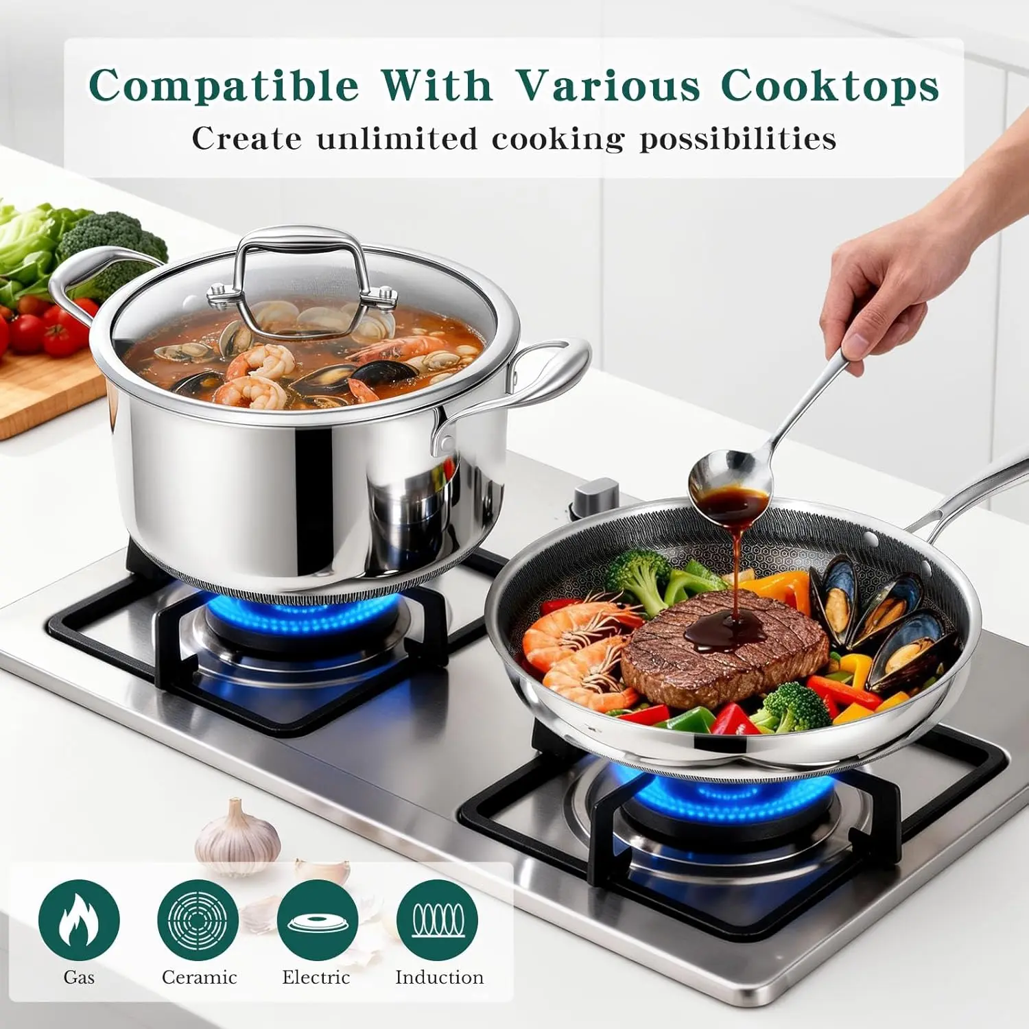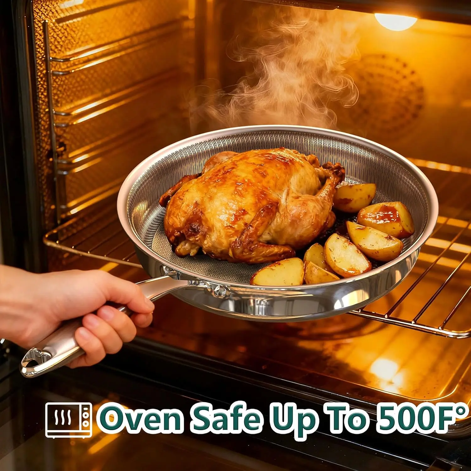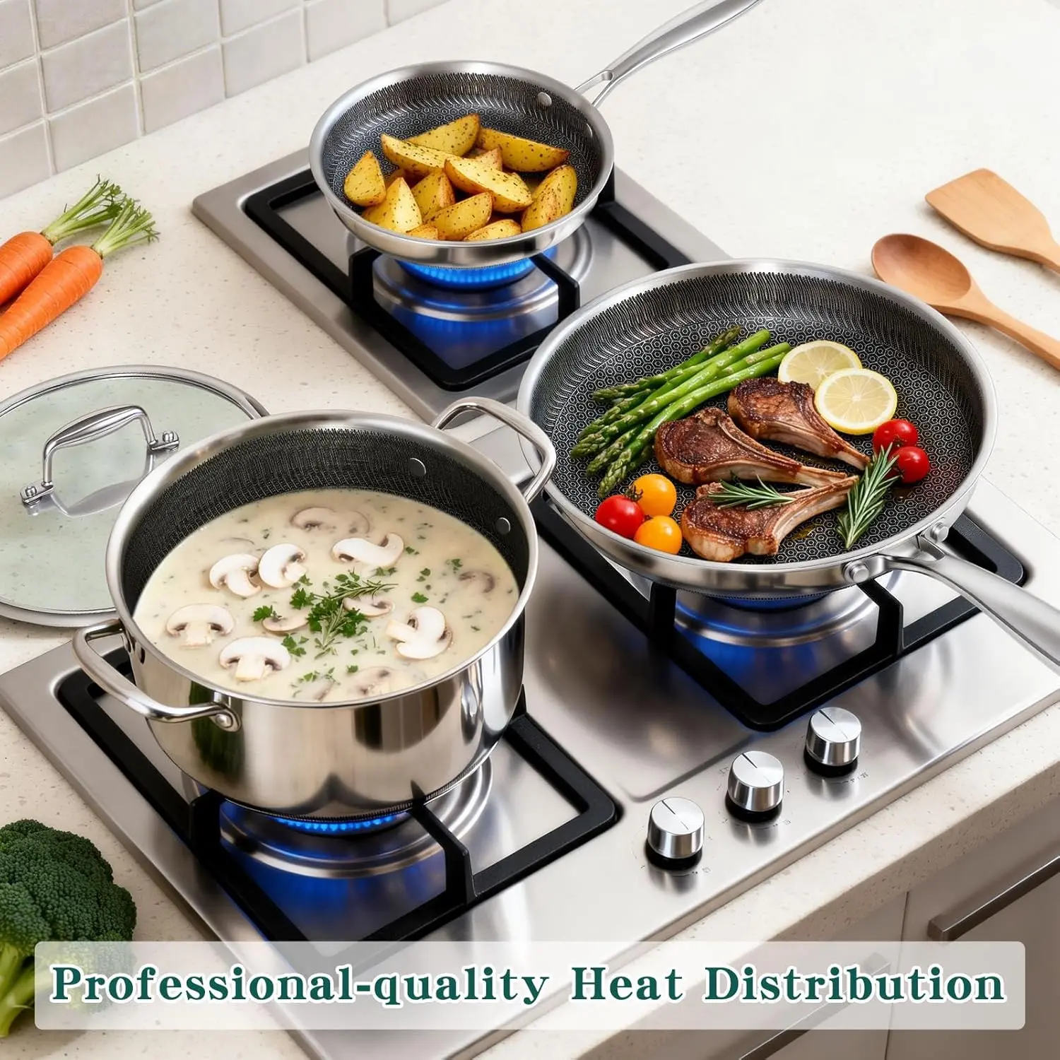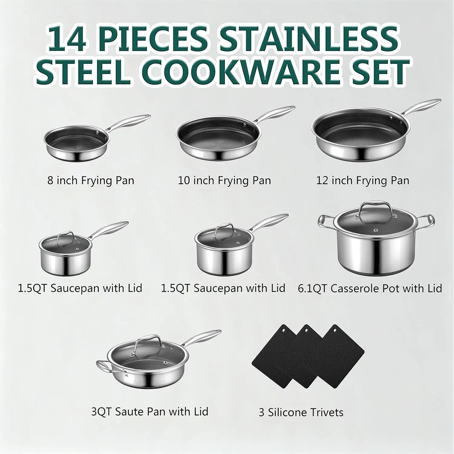 14-Piece Hybrid Stainless Steel Cookware Set, Non-Stick Pots and Pans Set with 3 Silicone Trivets| Induction Compatible Frying Pans, Saucepans, Saute Pan & Stock Pot| Oven Dishwasher Safe