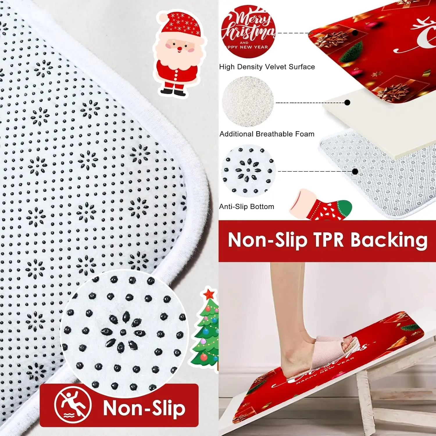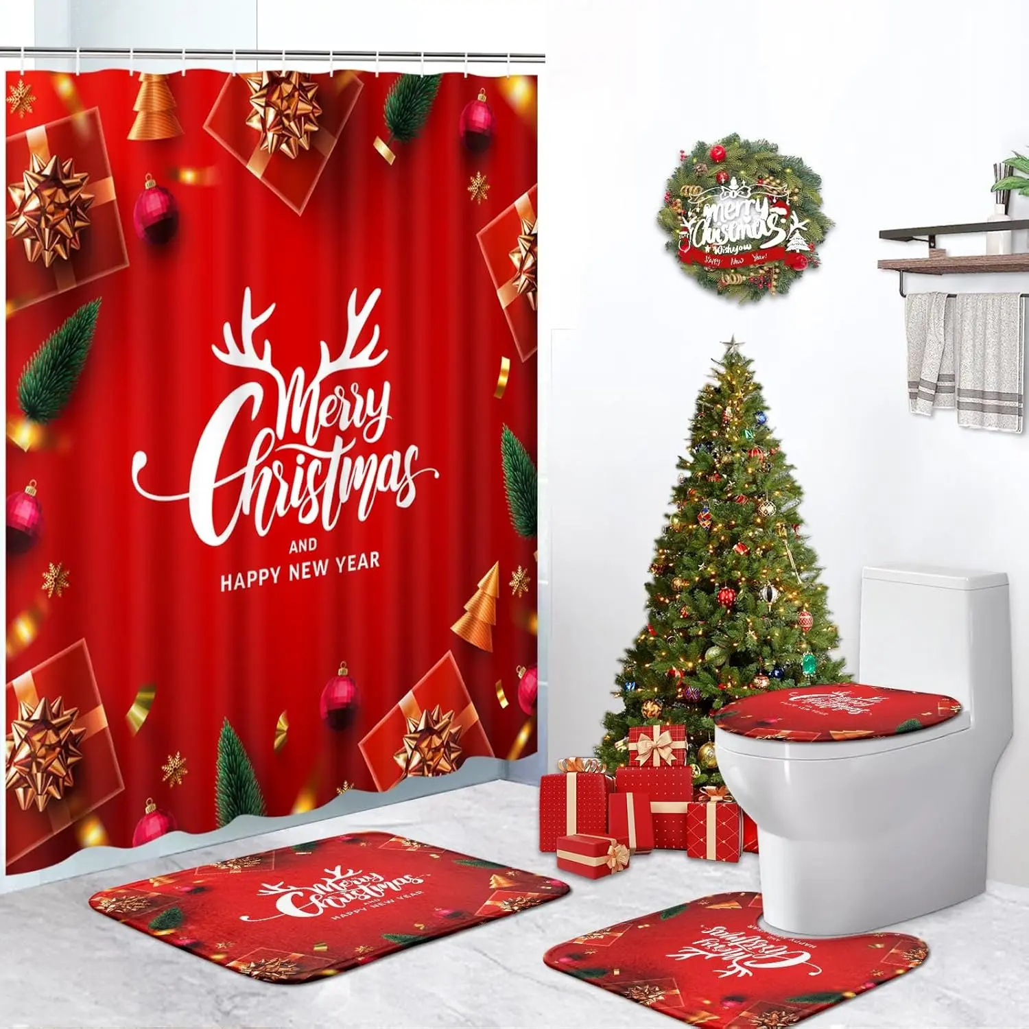 4 Pcs Shower Curtain Set Merry Christmas Happy New Year with Non-Slip Rugs Toilet Lid Cover and Bath Mat Bathroom Decor Set