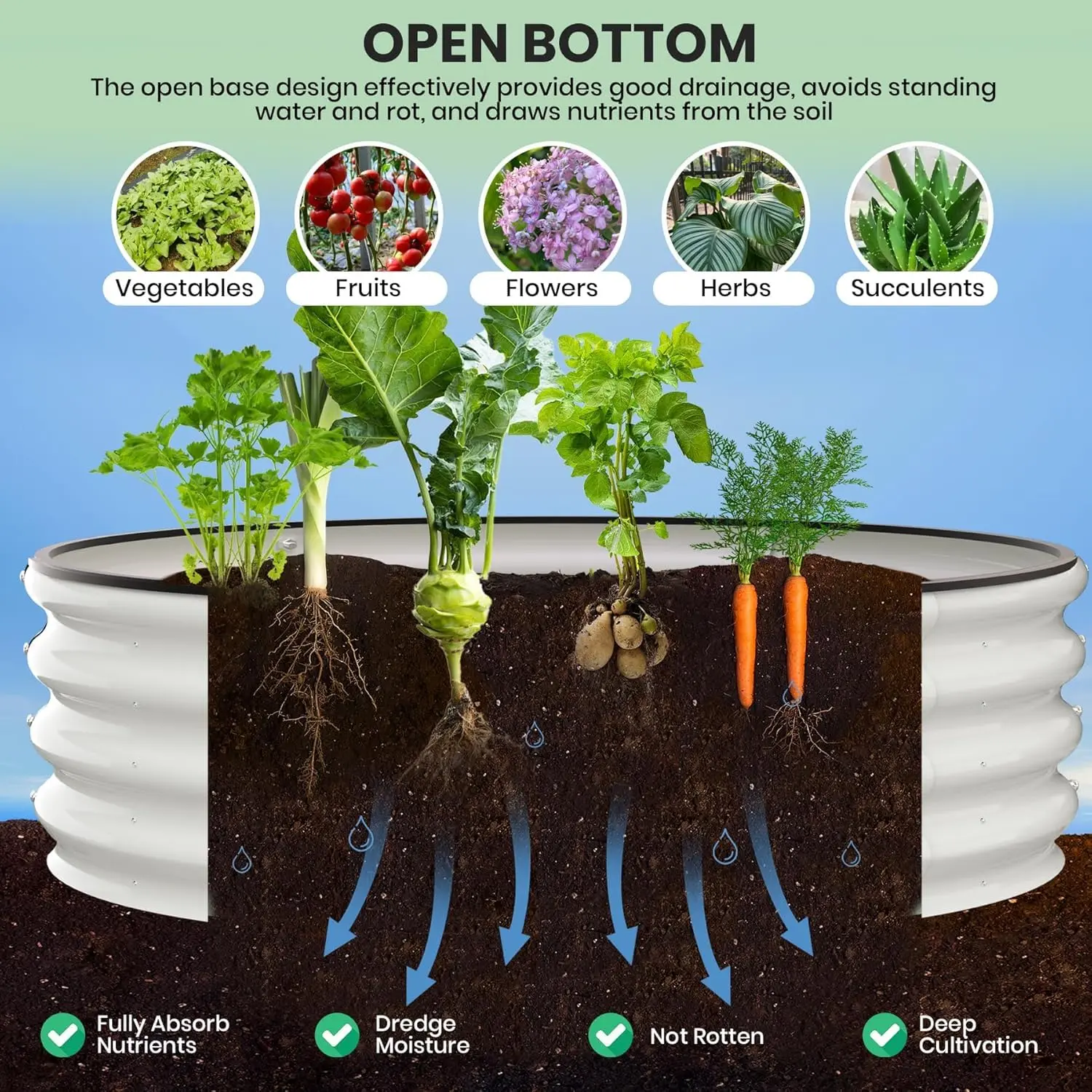 The innovative open‑bottom design allows seamless water drainage, preventing waterlogging and promoting optimal moisture levels. Plant roots can extend freely into the soil below, enhancing nutrient absorption and aeration for healthier growth and increased yields.