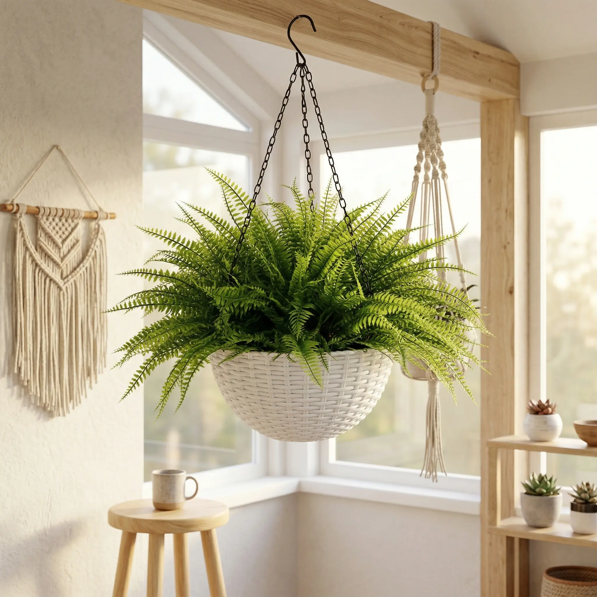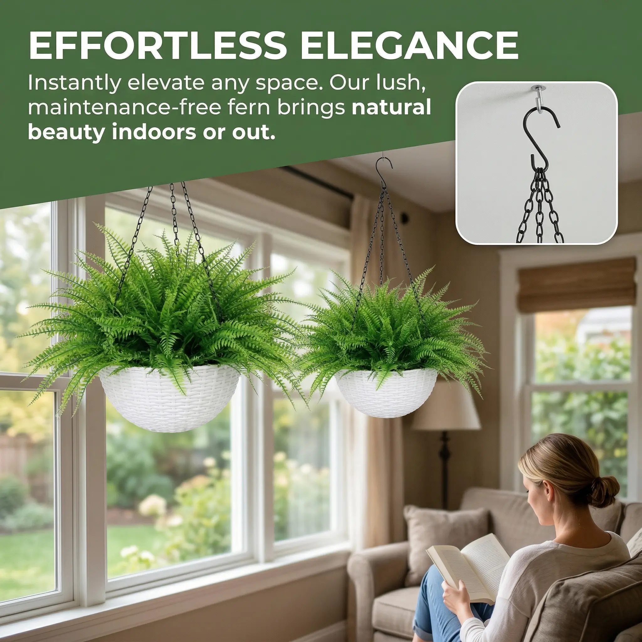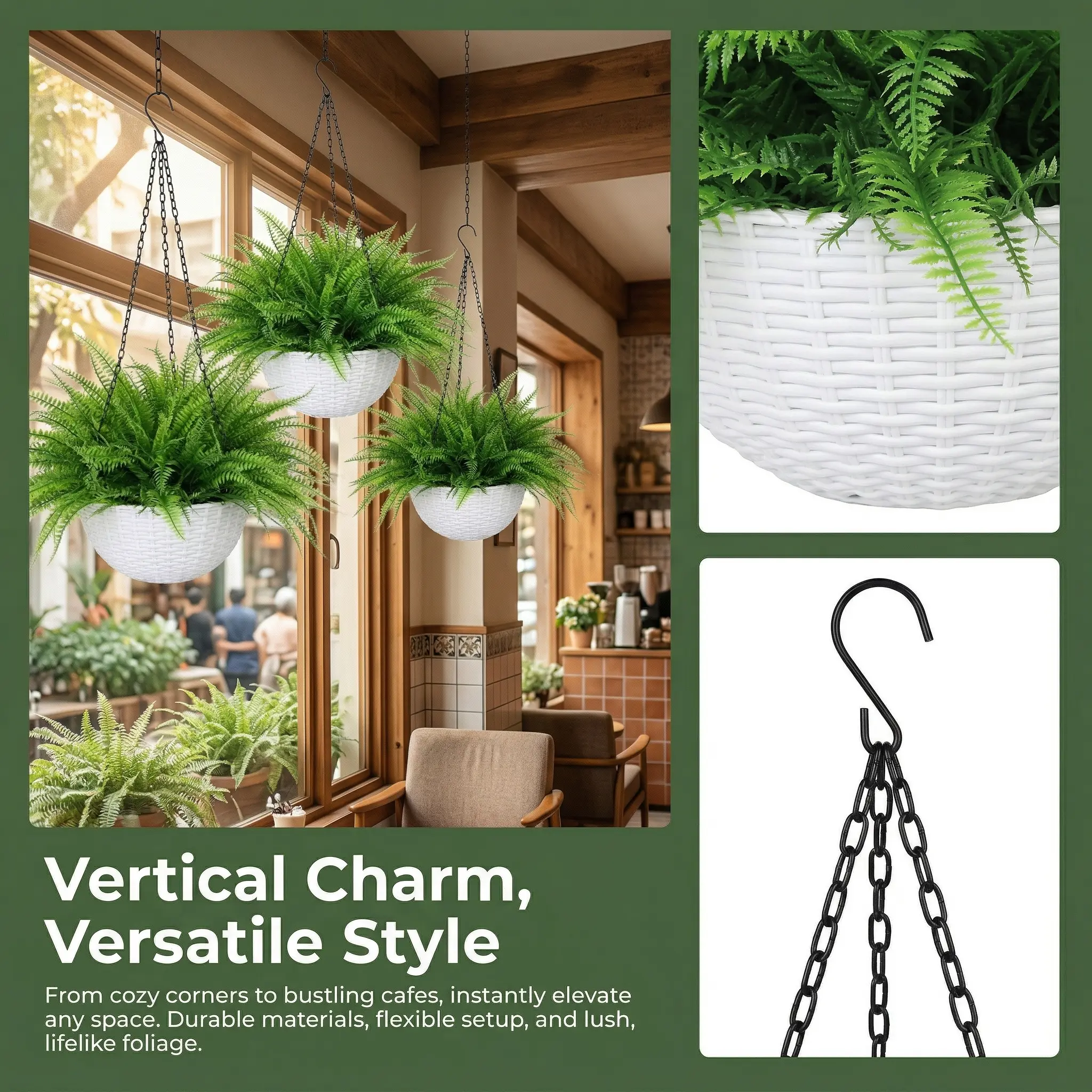 Sturdy construction and fade-resistant foliage make it perfect for year-round use indoors or outdoors. It comes with a strong metal chain for easy hanging, so you can instantly upgrade your porch, balcony, patio, living room, or entryway.