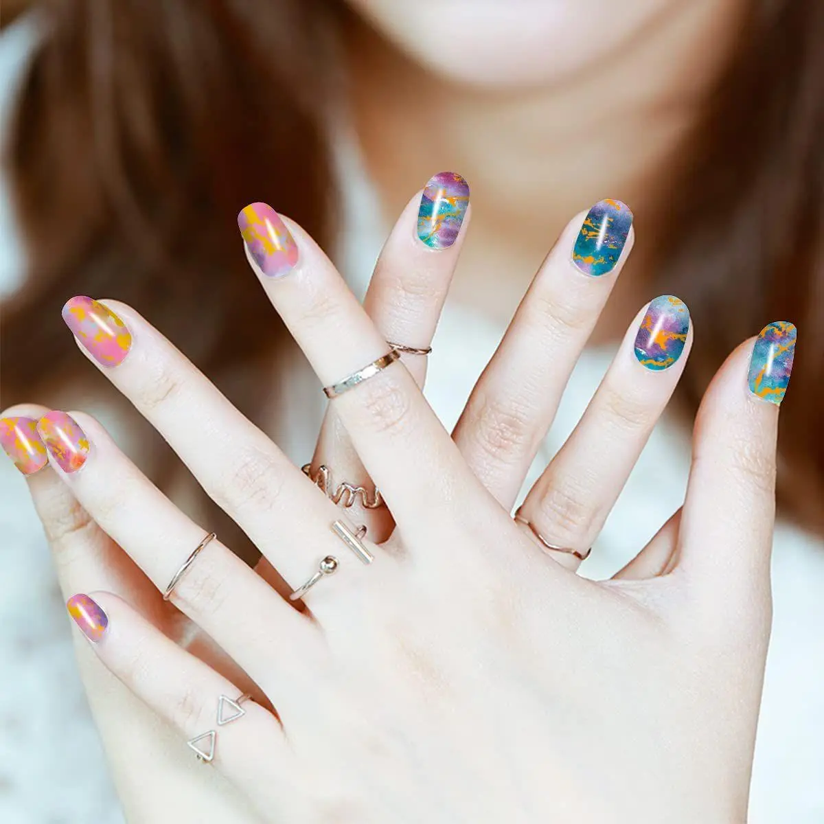 EASY TO USE-The nail polish wraps are self-adhesive design, it can be stick directly on nails.There will be no bubbles. Similarly, just peel off them if you want to remove them. Easy and time-saving. These nail polish stickers are suitable for decorating gel nail, acrylic nail, natural nail, false nail, nail tips and more. Suitable for home use or nail salons.