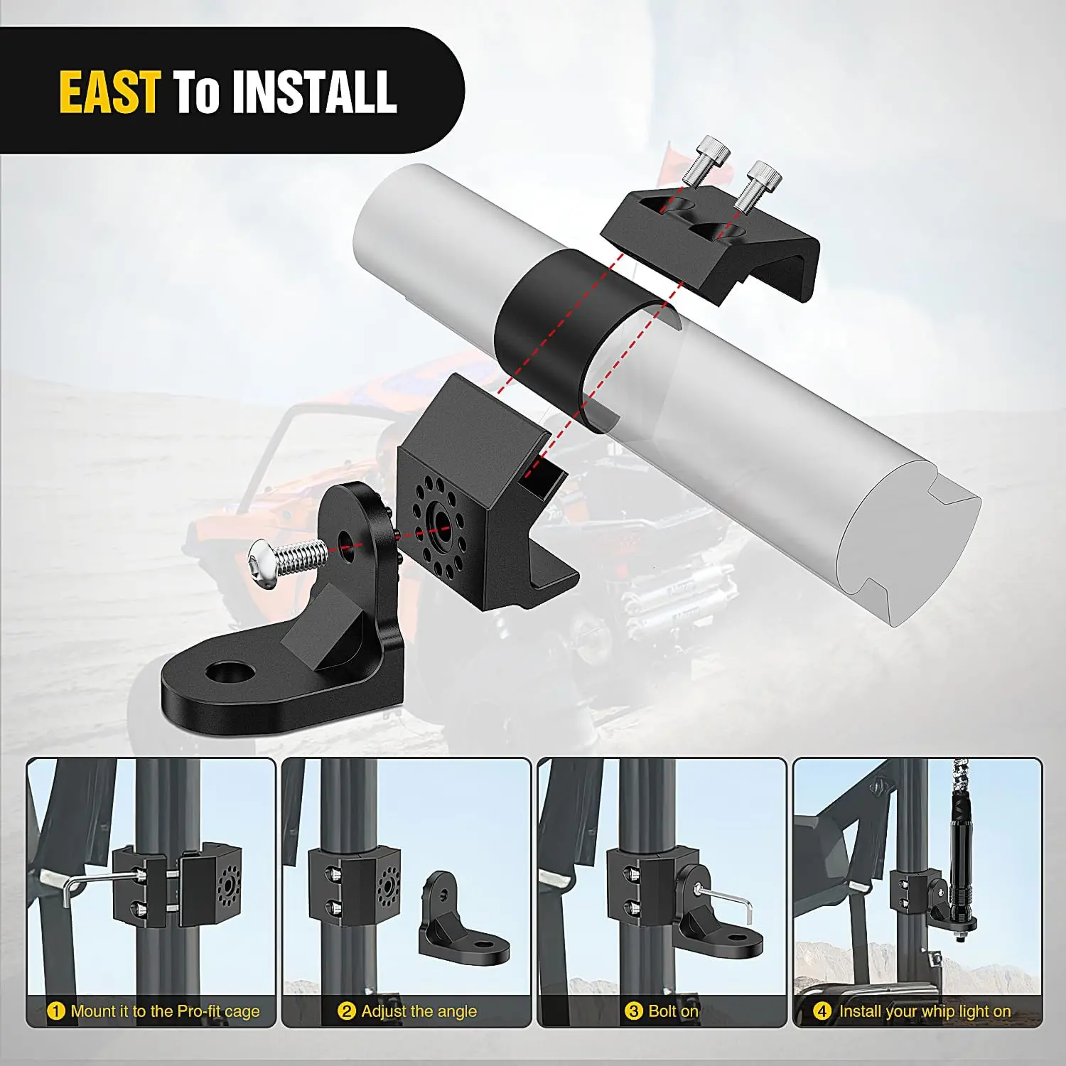 ·【Easy to Installation】 This UTV whip lights mount bracket is easy to install, all hardware included, directly bolt-on design, no drilling or trimming. And the mounting angle can be adjusted, you can loosen the bolt and change it to the perfect angle you want