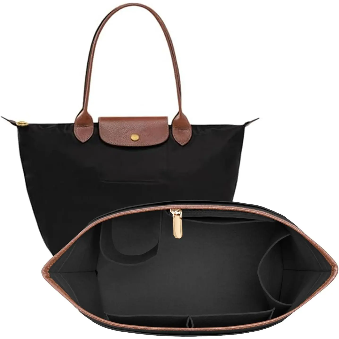Felt Purse Organizer Insert for Longchamp Le Pliage Bag, Handbag Leather edge Longchamp Organizer Insert with Cup Holder Tote Organize(Black, Large)