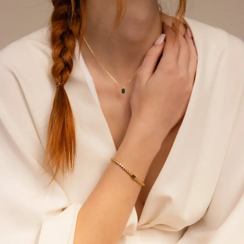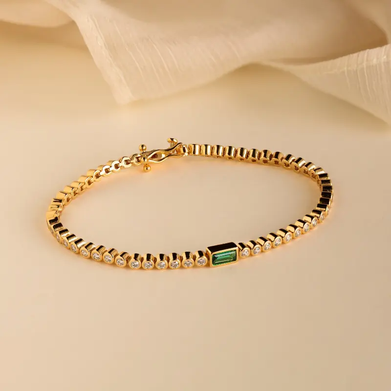 Our Emerald Baguette Tennis Bracelet is a perfect birthday gift for that someone special. Bezel CZ Diamond gemstones create the rest of the bracelet chain and allow every angle of this statement jewelry piece to sparkle. Gift it to your wife or best friend and it is sure to be a hit!