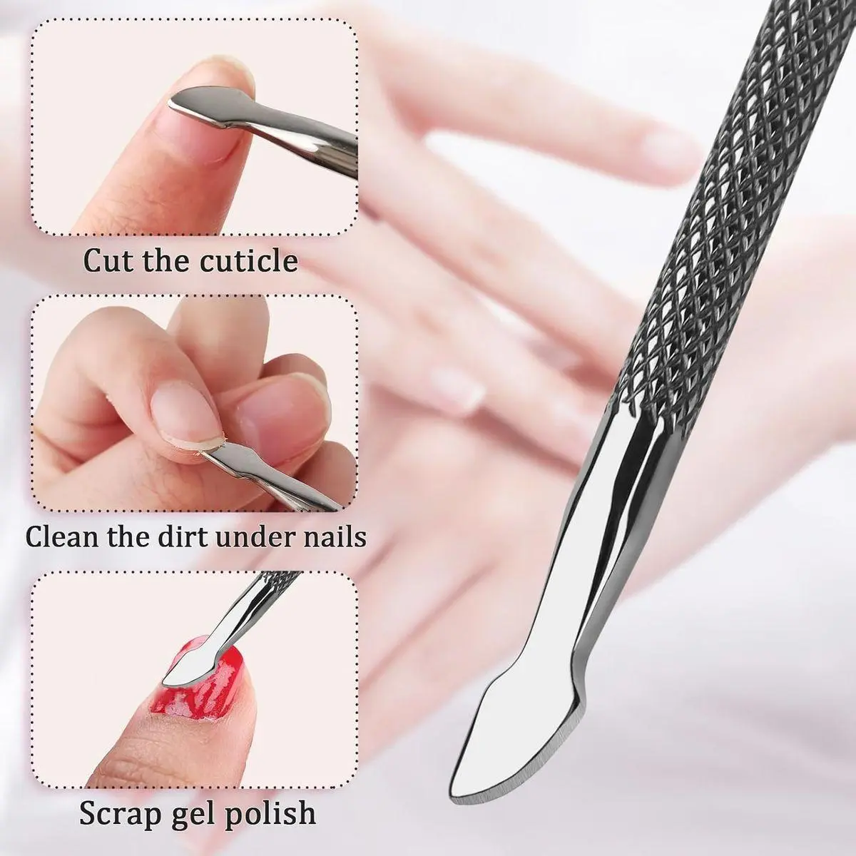 Dual-Headed Function: The dual-headed metal cuticle pusher includes a curved flat head for pushing back cuticles and a triangular head for removing dead skin and dirt from under the nails.