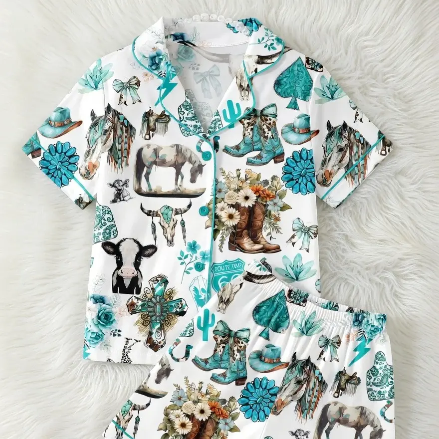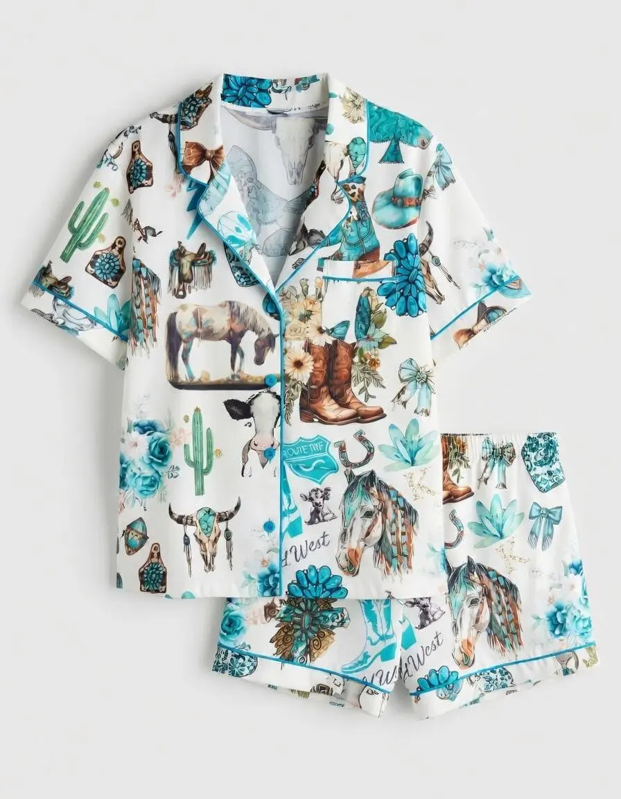 Western Cowgirl Pajama Set, Cowgirl Aesthetic Pajama Satin Set Turquoise Horses, Boots & Cactus Satin Pajamas