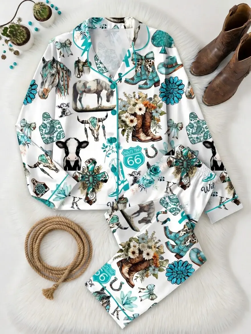 5. Western Cowgirl Pajama Set, Cowgirl Aesthetic Pajama Satin Set Turquoise Horses, Boots & Cactus Satin Pajamas