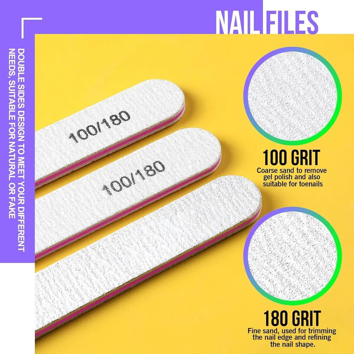 High Quality Nail Files: 100/180 Grit Nail Files: Made of premium adhesive tape and emery board materials. The 100 grit is coarse sand to remove gel polish and also suitable for toenails. The 180 grit is fine sand, used for trimming the nail edge and refining the nail shape. Double sides design to meet your different needs, suitable for natural or fake nails.