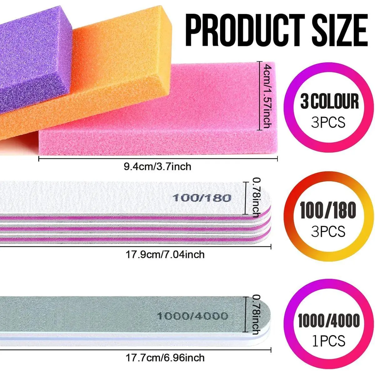 Package Included: 3Pcs rectangular nail buffer block 3 colors: purple, pink and orange. 3Pcs double side 100/180 grit nail files and 1Pcs white and green nail polishing buffer. One kit includes 3 types useful nail care tools for daily home nail care and professional nail salon for manicure.