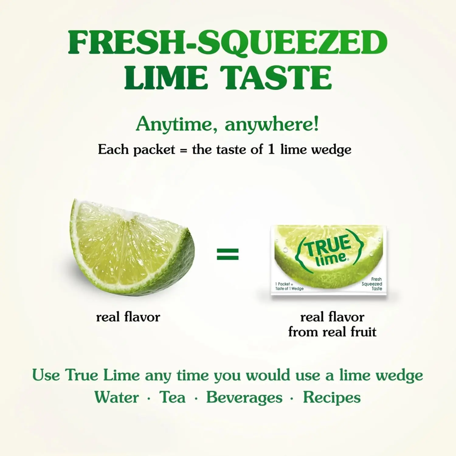 ·Alternative to Lime Wedges & Lime Juice: 1 packet = the taste of 1 lime wedge, 2 lime packets = 1 tbsp of lime juice, 6 packets = 1 squeezed lime; True Lime is shelf-stable and always provides consistent fresh squeezed lime taste