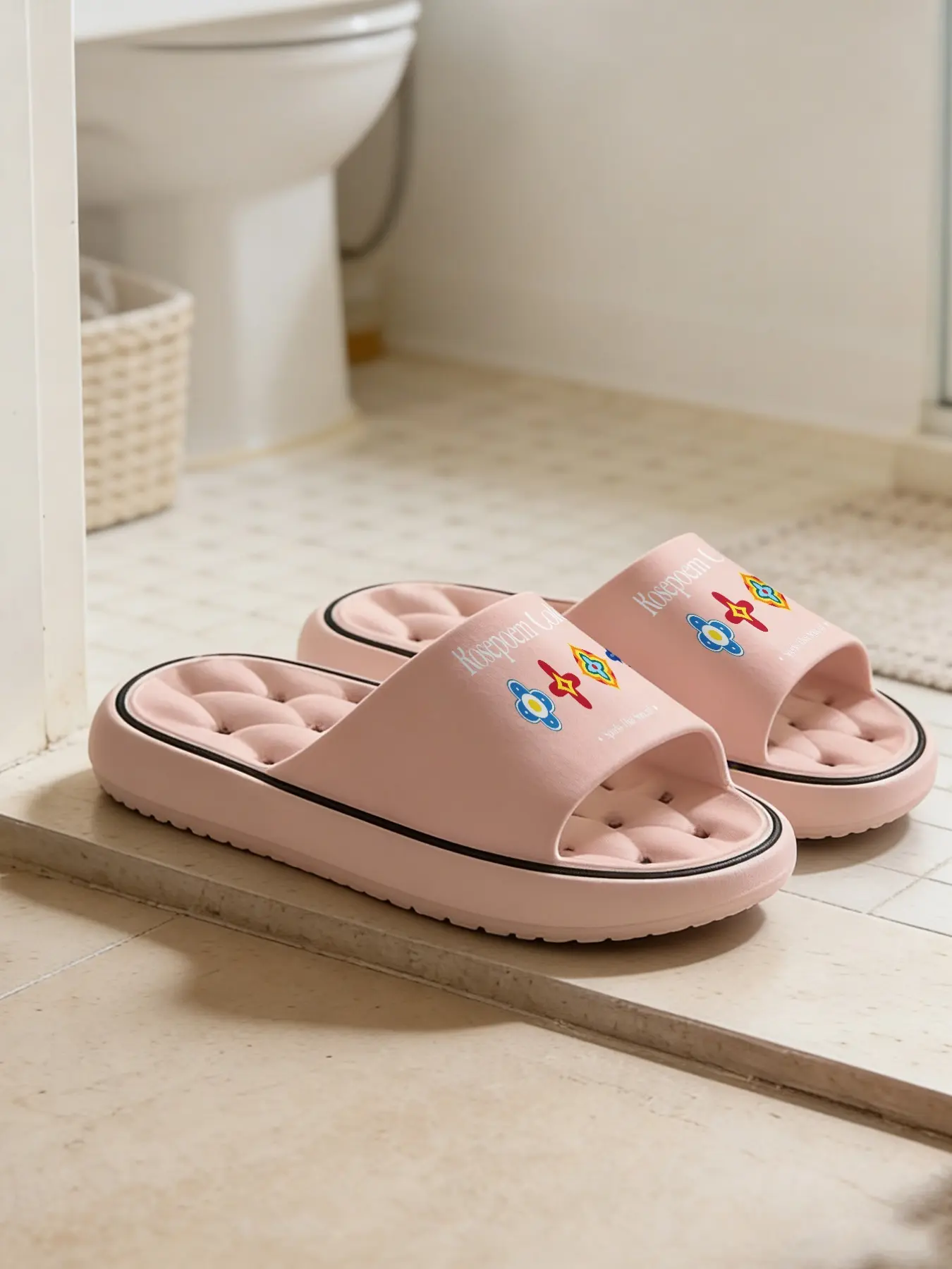 1 Pair Cartoon Animal Letter Printed Hollow Massage Thick Sole Slippers, Cute Healing Style, Non-slip Soft Sole, Quick-dry for Bathroom, Indoor & Outdoor Dual-use, Open Toe Slides, Bathroom Casual Slippers
