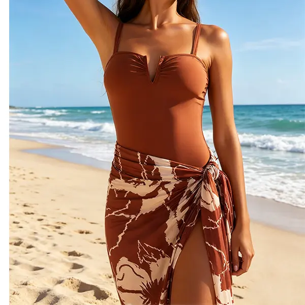 VERSATILE 2-PIECE SET: Includes a solid brown one-piece swimsuit + a tropical floral wrap sarong, doubling as a swimsuit cover and casual exercise dress for daily outings.