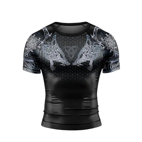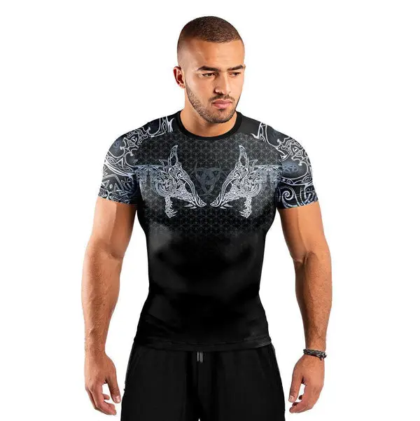 5. Geri & Freki Tattoo Viking Men's Short Sleeve Rash Guard – Norse Mythology-Inspired Design, Bold Geri & Freki Wolf Graphic, Perfect for Workout, Outdoor Adventure, and Activewear, Ideal Gift for Viking & Mythology Fans