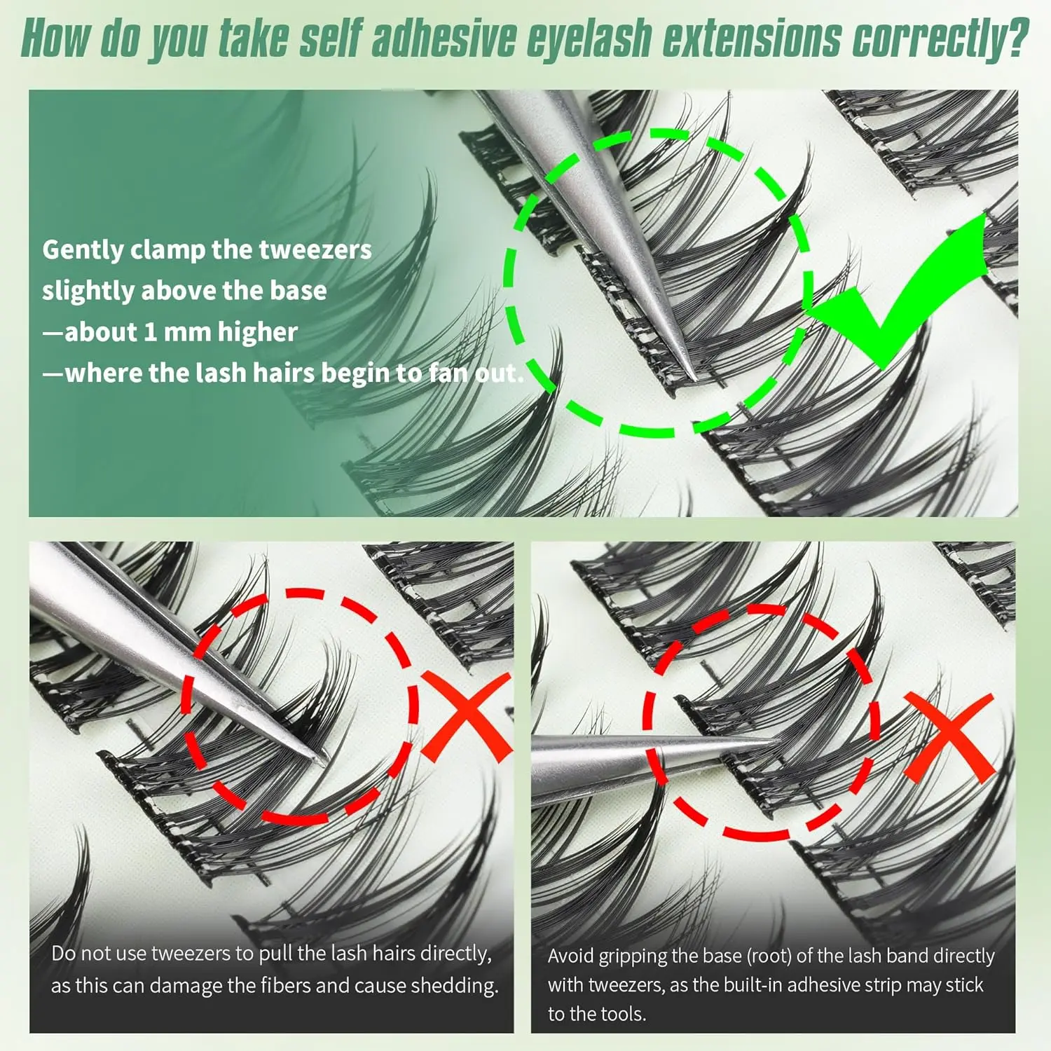 ·Featuring invisible self adhesive tapes, these no glue lash clusters blend flawlessly with your natural lashes. The upgraded pre-glue eyelashes offer a strong yet gentle grip, staying put all day without slipping or leaving residue. Enjoy salon-quality stick on lashes with 0 fuss!