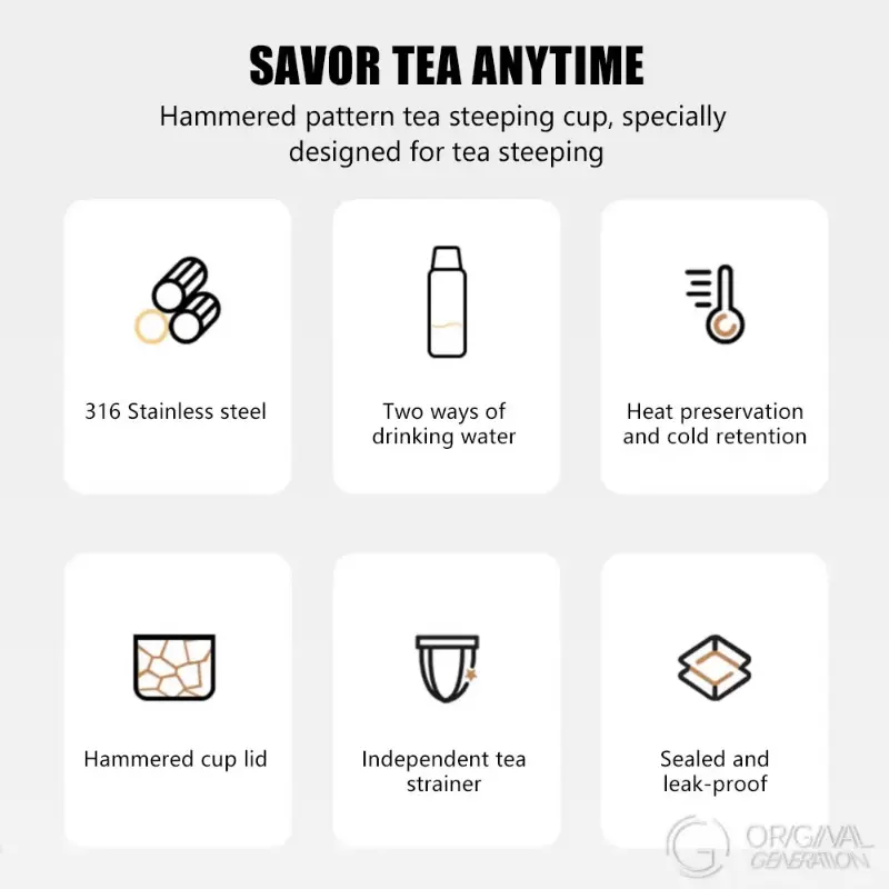 Elevate your tea experience with this 316 Steamer Pressure Thermos. It combines steeping and drinking functions, ideal for gongfu/chinese tea styles. The double-walled insulation keeps tea hot for 2+ hours or cold for 4+ hours, ensuring comfort. Made from borosilicate glass and food-grade stainless steel, it's both durable and safe.