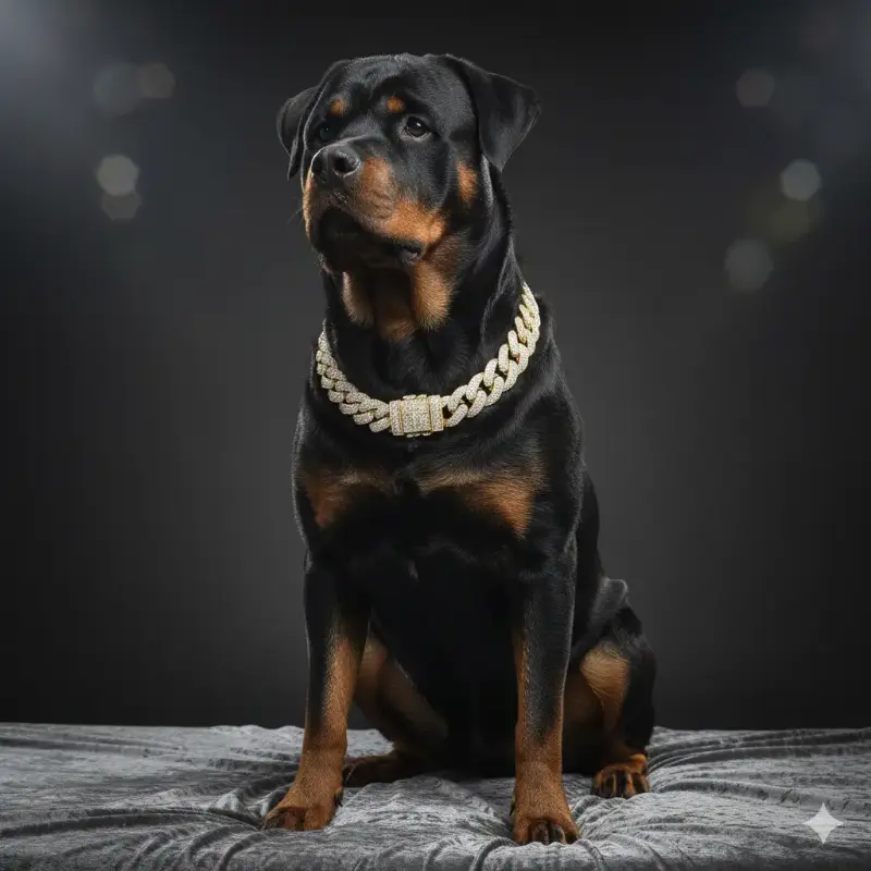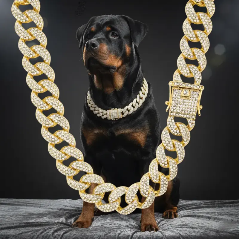 Elevate your pet's style with this luxurious set. The collar and necklace feature a gold or silver finish, plated over alloy for durability. Choose from three chain lengths: 18", 20", or 24". Each piece is adorned with iced cubic zirconia stones, adding a touch of elegance. Perfect for dogs, this set combines functionality with fashion.