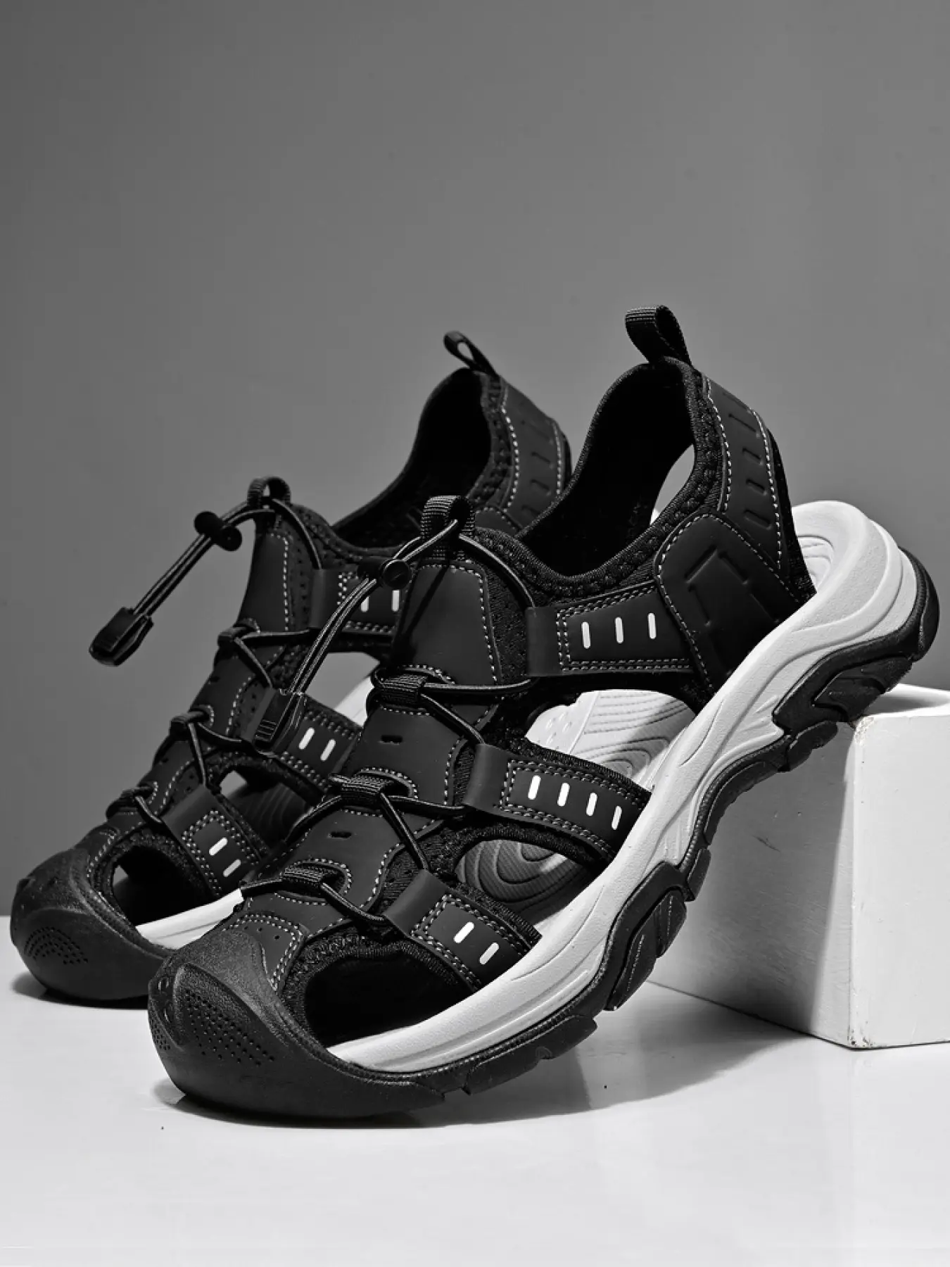 Men's Black and White Drawstring Closed-Toe Outdoor Sandals Thick-Soled Non-Slip Hollow-Out Water Shoes Breathable Durable Beach Hiking Shoes