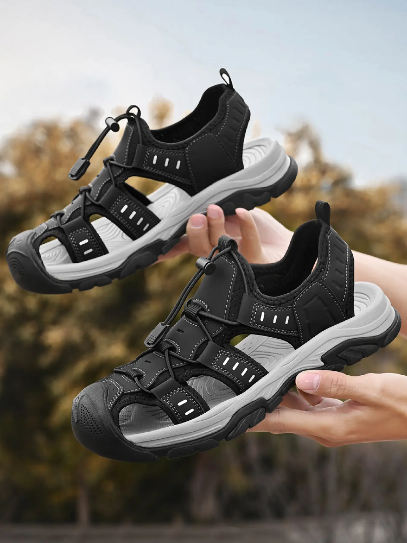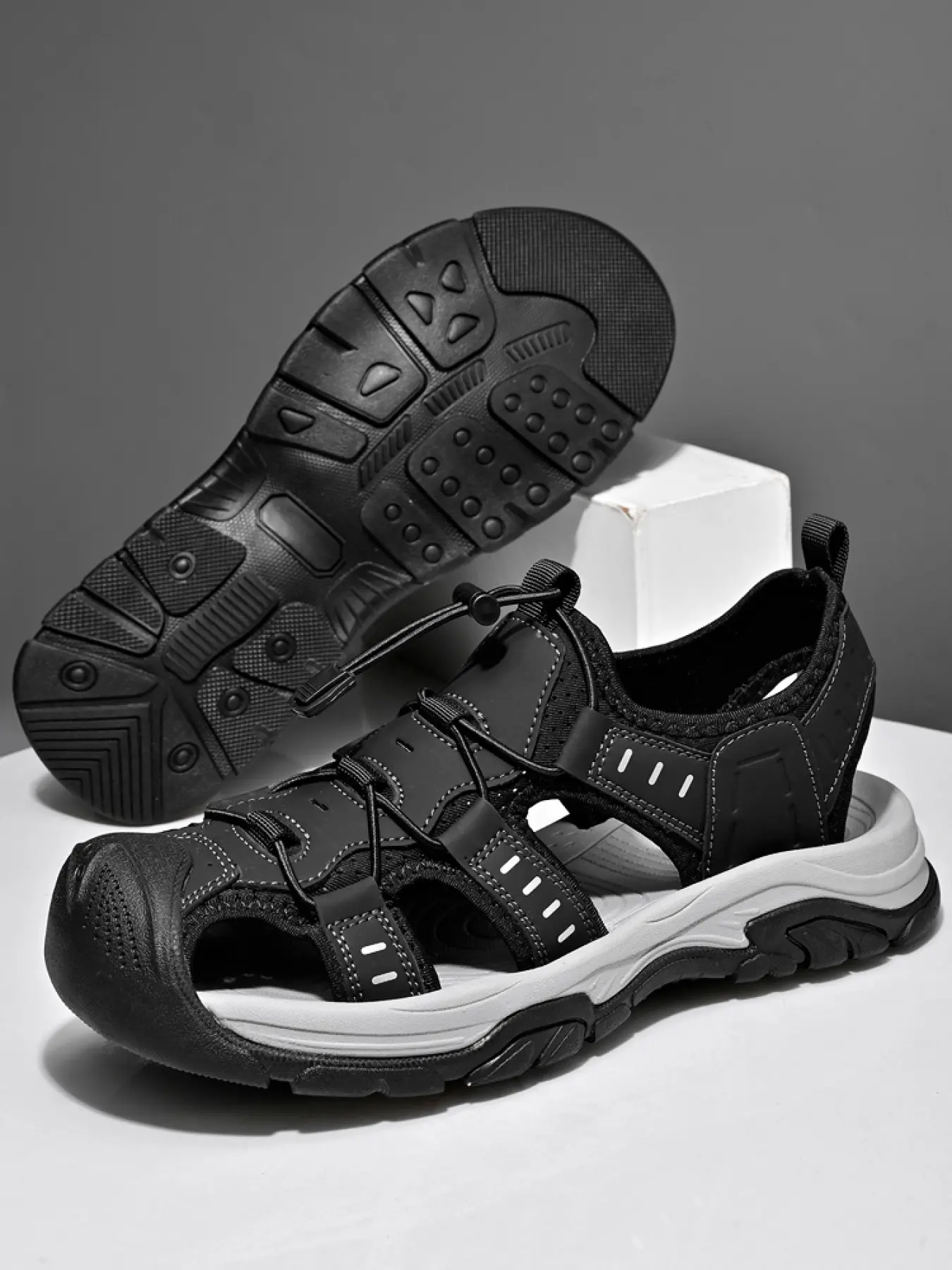 Men's Solid Color Mesh Breathable Outdoor Water Shoes Drawstring Two-Way Closed-Toe Sandals Non-Slip Wear-Resistant Soft Sole Hiking Shoes
