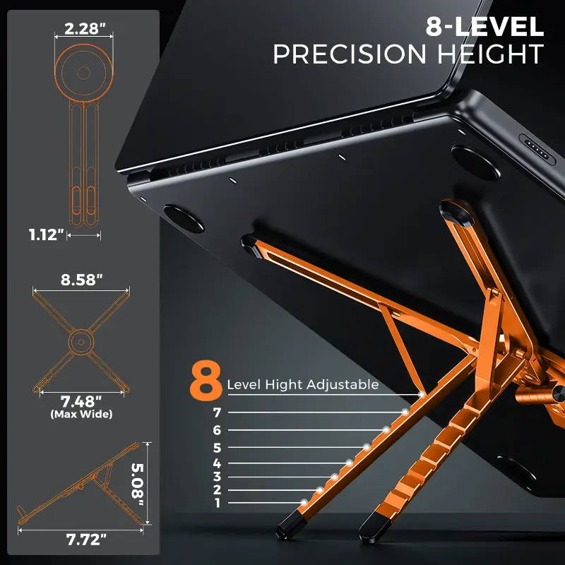 [8-Level Height + Stepless Angle Adjustment] Offers 8 levels of laptop height adjustment (1.89-5.11 inches) for an ergonomic typing and viewing experience; or freely adjust the angle of your desktop phone/tablet up to 5.9 inches. Effectively reduces neck, wrist, and back fatigue during long hours of work, video watching, or studying.
