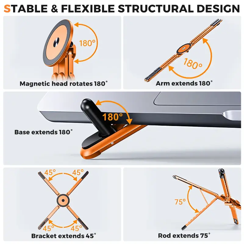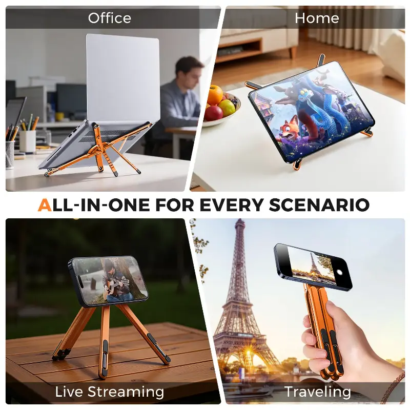 [Multifunctional Stand for Laptops, Phones, and Tablets] Functions as a foldable laptop stand (10-16 inches), a desktop magnetic phone/tablet stand (4-13 inches), or a travel hanging stand for use on planes, buses, and trains. One compact device allows you to switch between work, study, and travel modes anytime, anywhere.