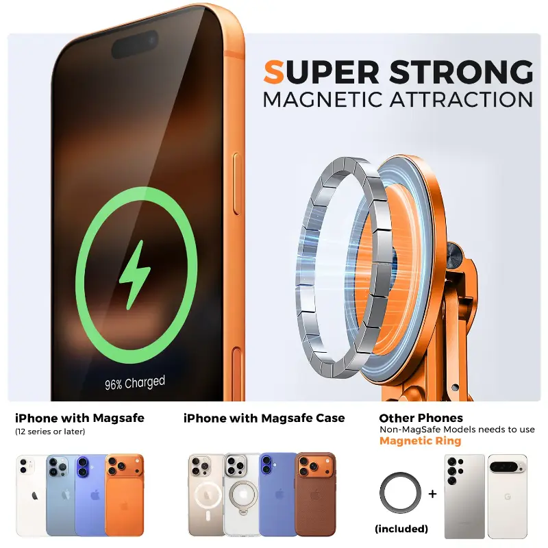 [Powerful N52 Magnetic Adsorption for Phones and E-readers] Upgraded N52 magnets provide instant and secure attachment for MagSafe-compatible smartphones and lightweight devices like Kindles. Perfect for video calls, watching content, or hands-free browsing. Includes a metal ring for non-magnetic devices.
