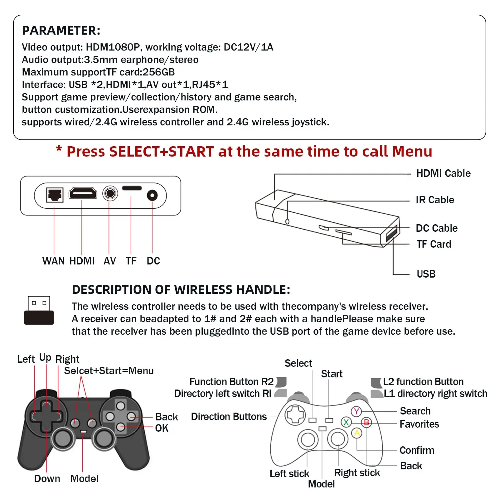 Hardware Protection: Insert/remove the TF card only when the game box console is turned off to prevent data loss; plug/unplug HD and USB ports gently to avoid port deformation. Keep the device away from water, high-temperature environments and direct sunlight.