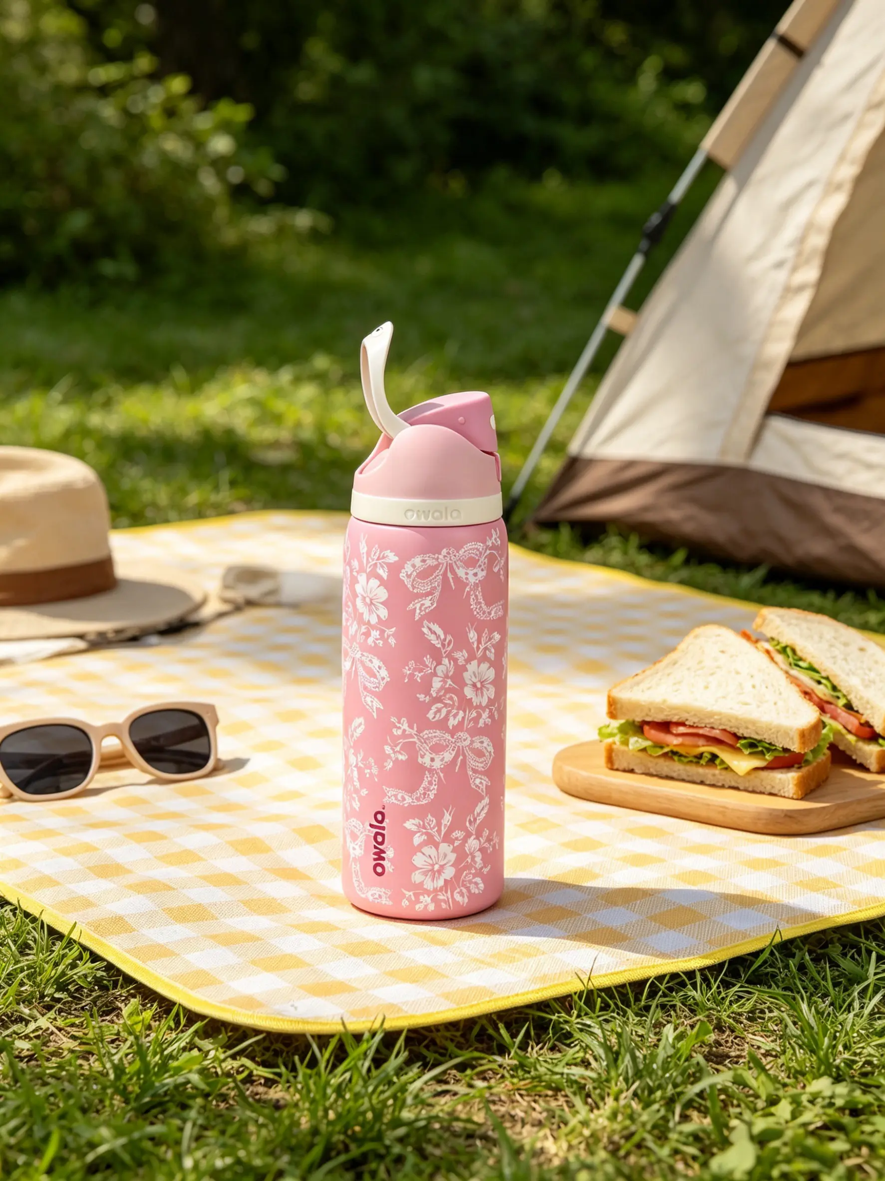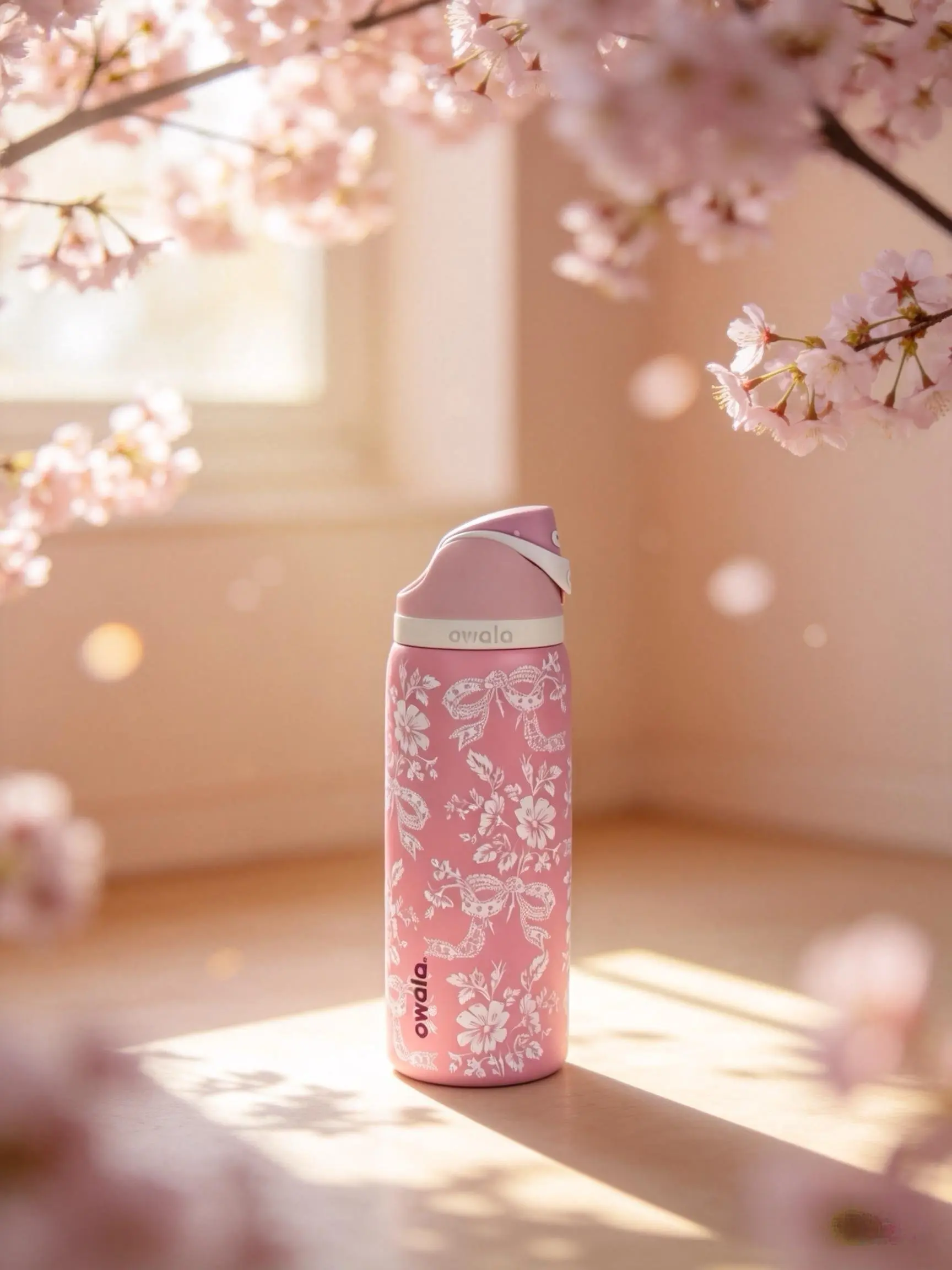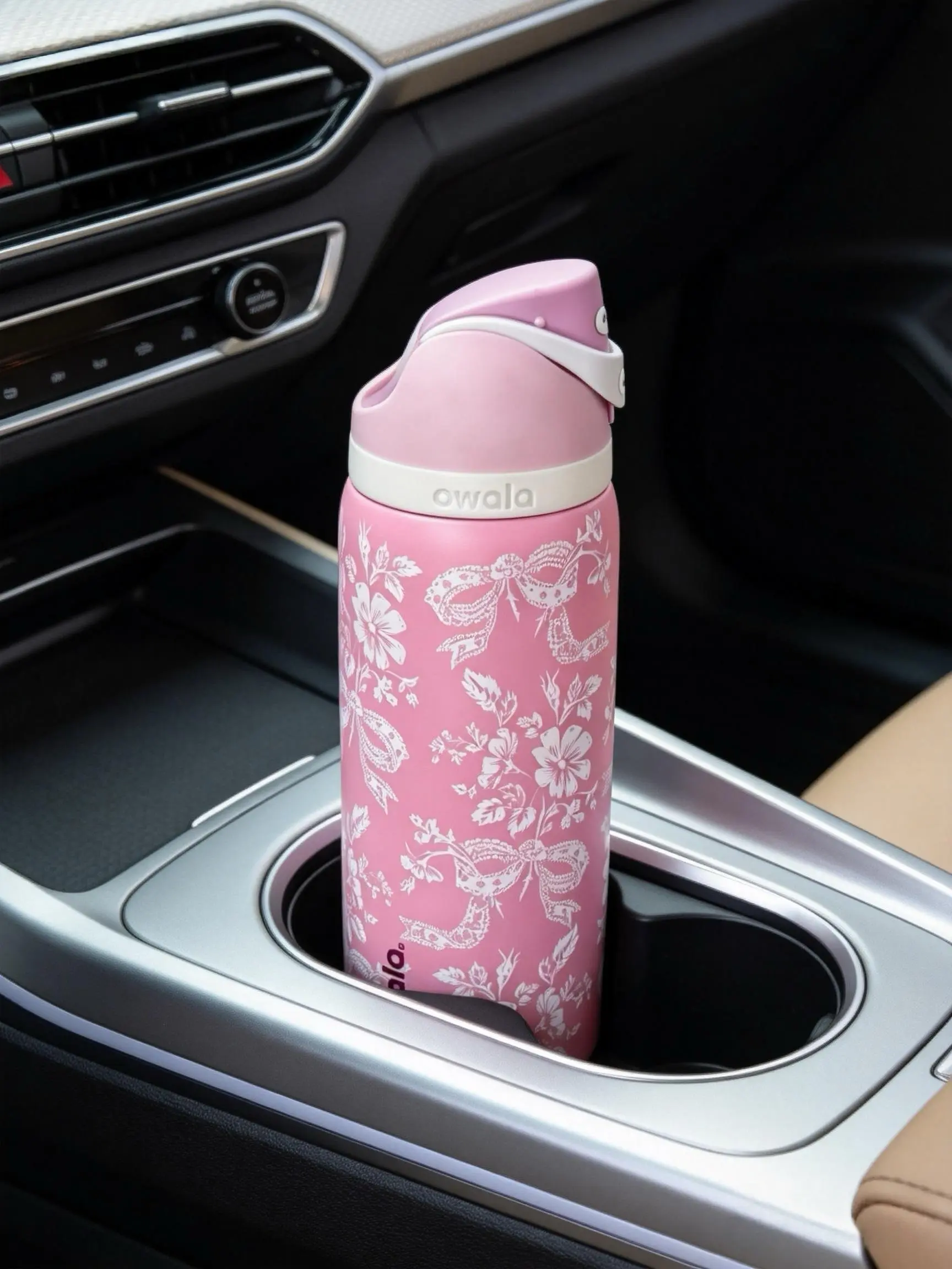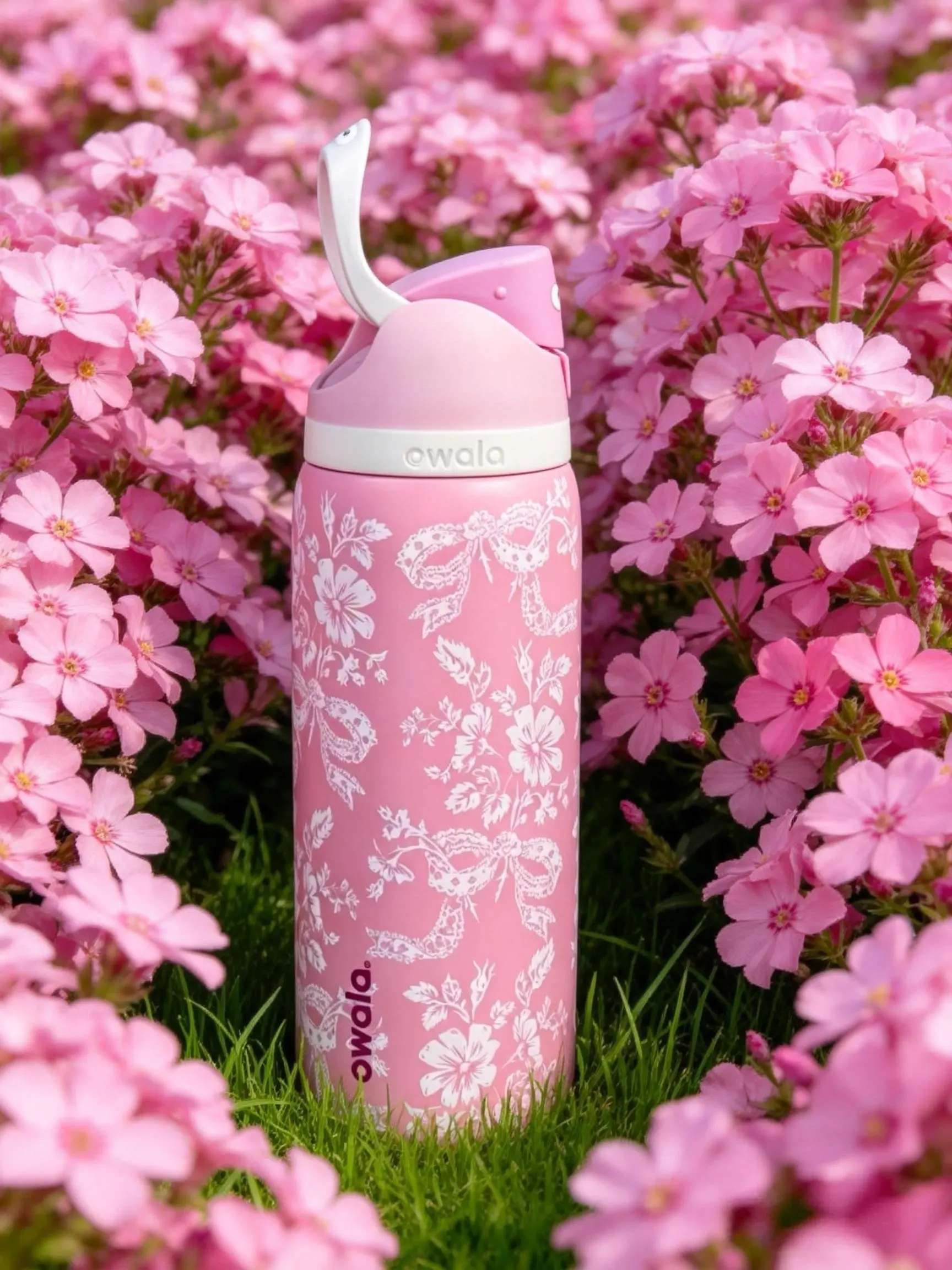 The cup boasts a charming floral pattern in a soft pink hue. The Owala logo is subtly placed, adding a touch of brand identity. It's a practical choice for those who value both style and functionality in their everyday accessories. 🌸