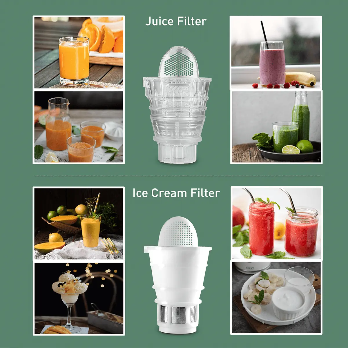 ·Two filters (Juice filter and Ice cream filter) can make a variety of recipes.