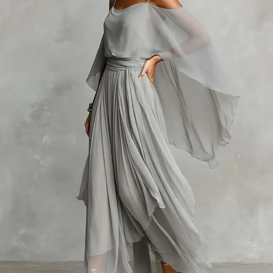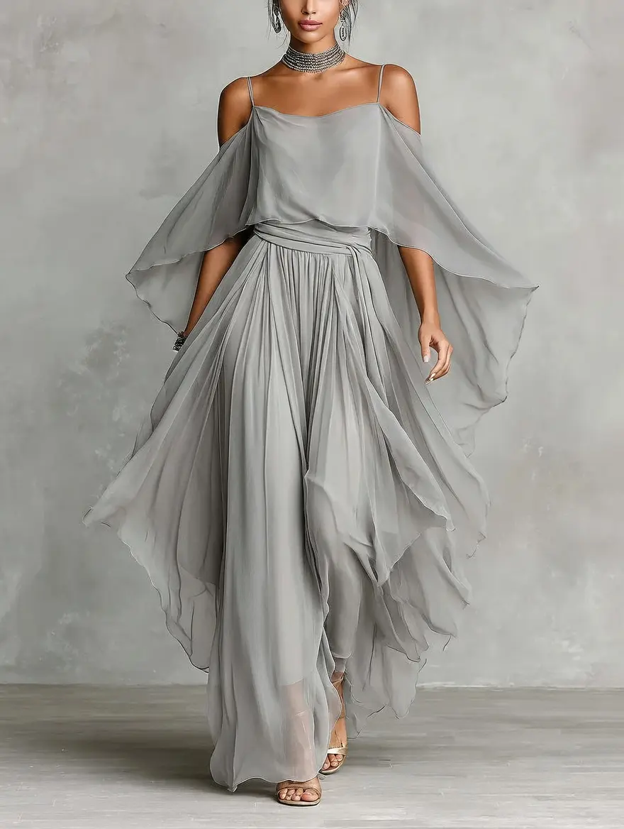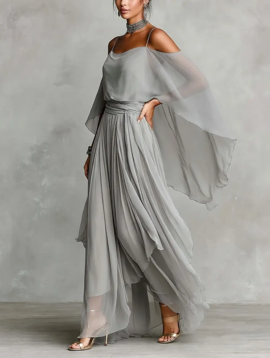 womens dressy pantsuits for evening wedding guest outfits for women elegant flowy chiffon two piece set formal wide leg palazzo pants jumpsuit cold shoulder draped cape dress grey silver party attire ethereal fashion 2026 spring collection.