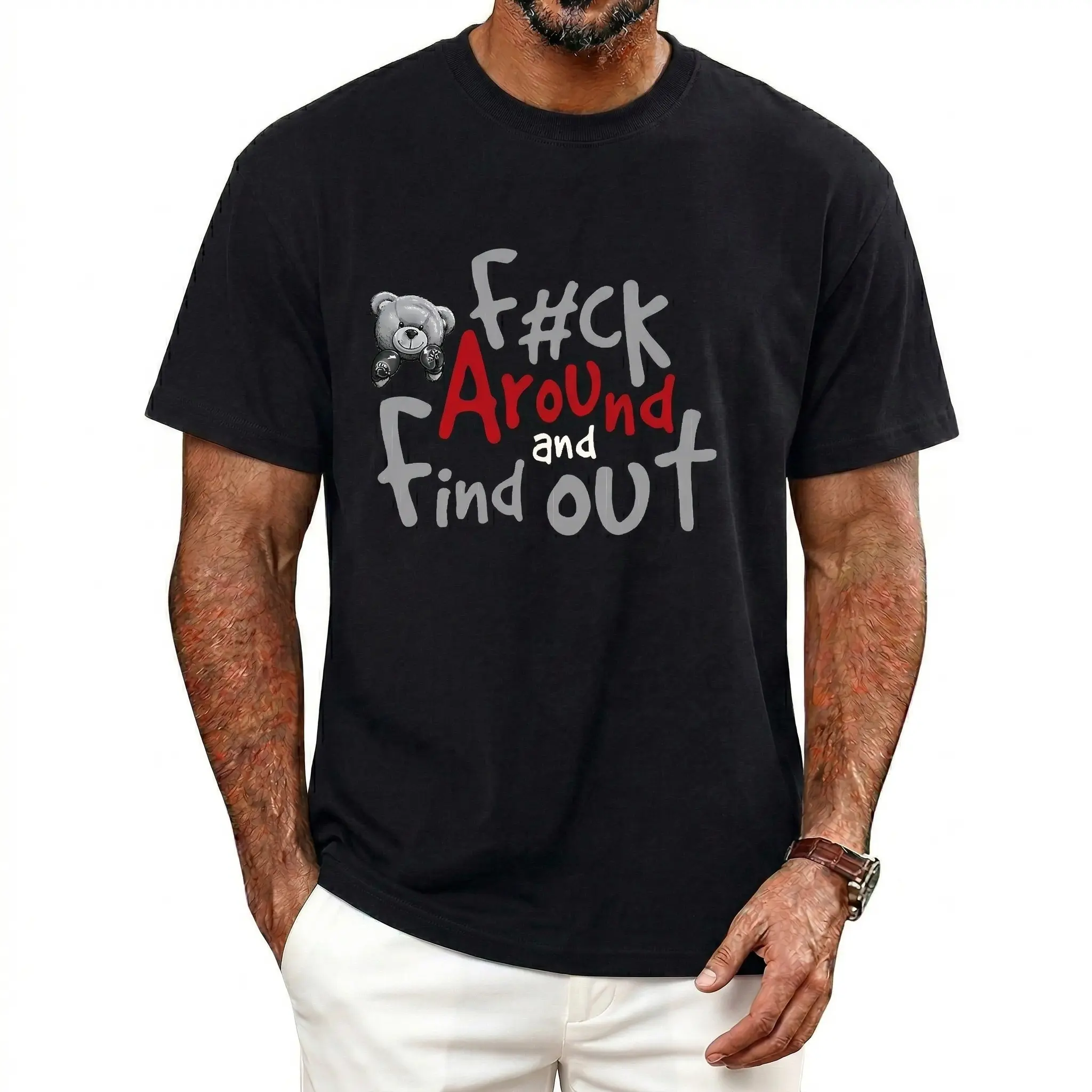 Men's Casual T-Shirt With Boxer Bear Graphic - "FK AROUND AND FIND OUT" Print, Short Sleeve, Round Neck, Machine Washable, All-Season Comfort Golf Gift T-Shirt For Men And WomenMen's Casual T-Shirt With Boxer Bear Graphic - "FK AROUND AND FIND OUT" Print, Short Sleeve, Round Neck, Machine Washable, All-Season Comfort Golf Gift T-Shirt For Men And Women