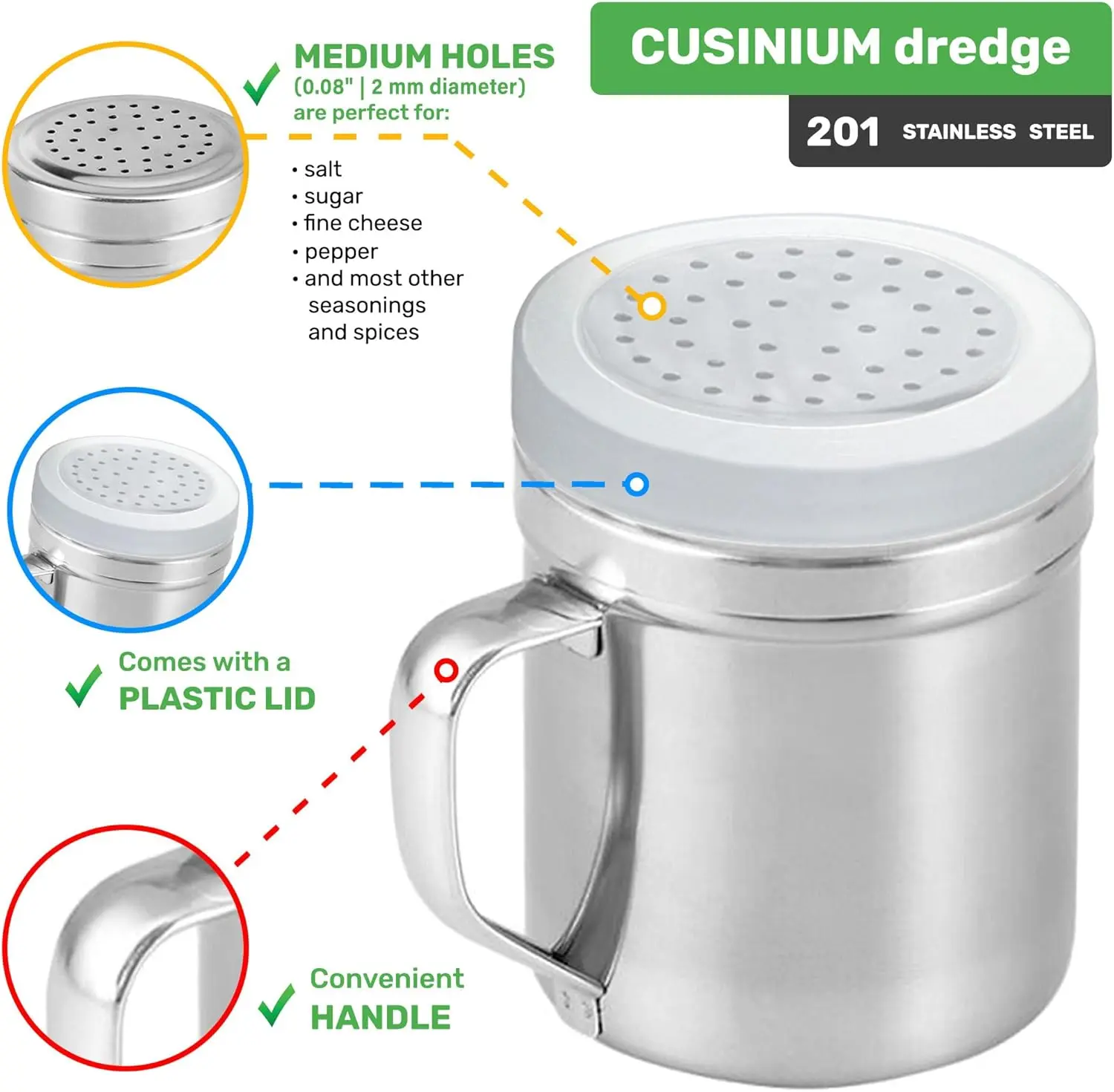 Each dredge comes with a handle, a twist-off lid, and a plastic cup to protect from moisture