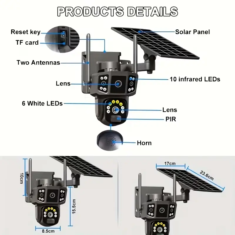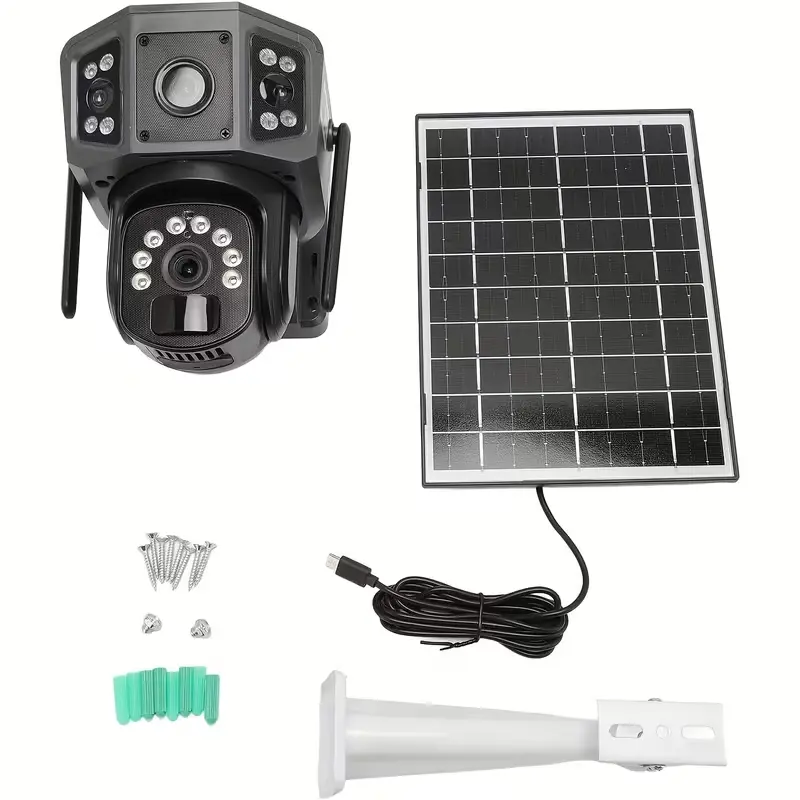 Solar-powered Security Camera | 8000mAh Battery, Color Night Vision, Triple-lens 360° Panoramic View, PIR Human Detection, Loop Recording, 2.4G WiFi App For Remote Real-time Viewing | Suitable For Farms, Gardens, Warehouses