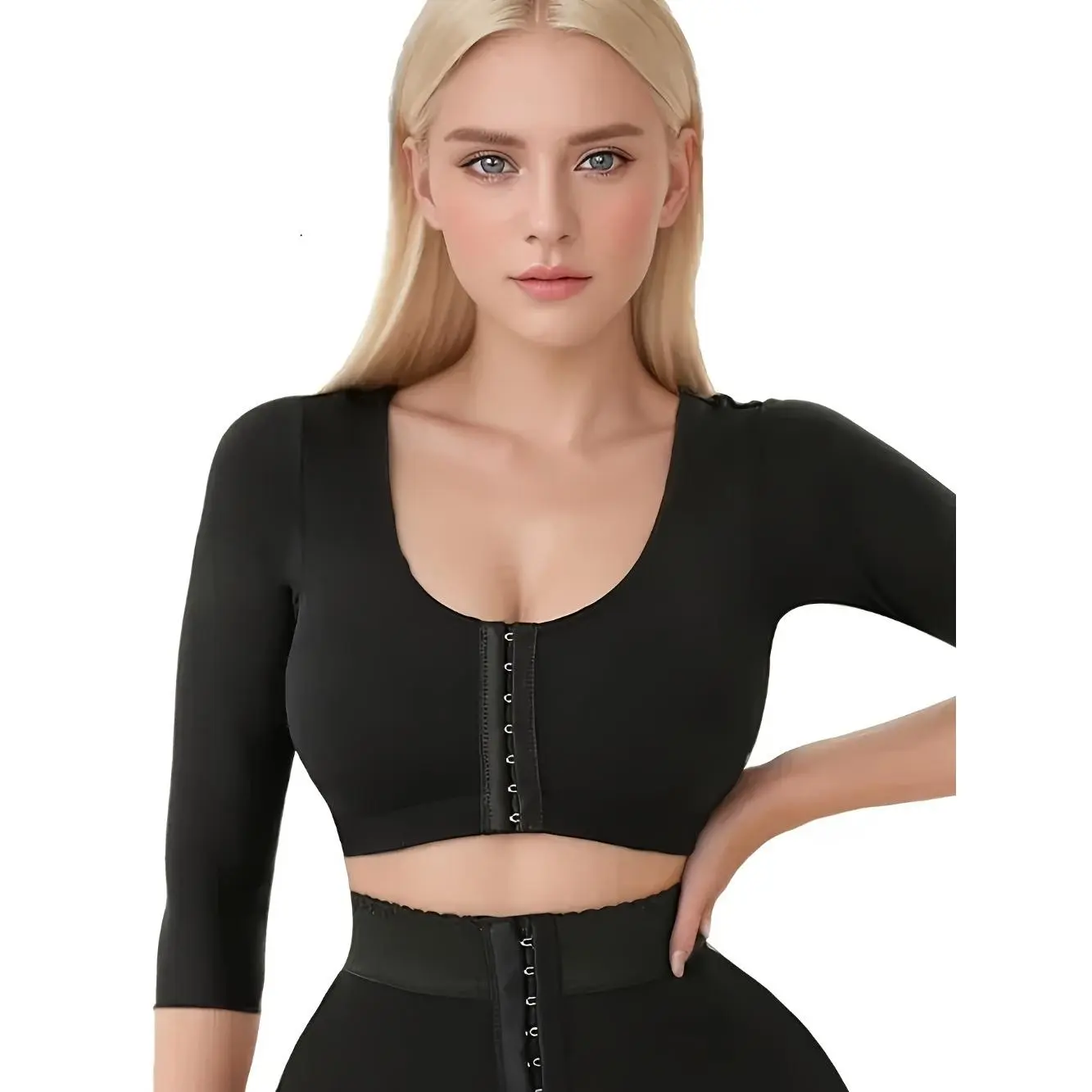 This shapewear bra is perfect for women post-surgery or after arm lipo. It features a front closure design for easy wear. Ideal for those seeking compression and support. The sleeves help in shaping the arms, providing a sleek look.