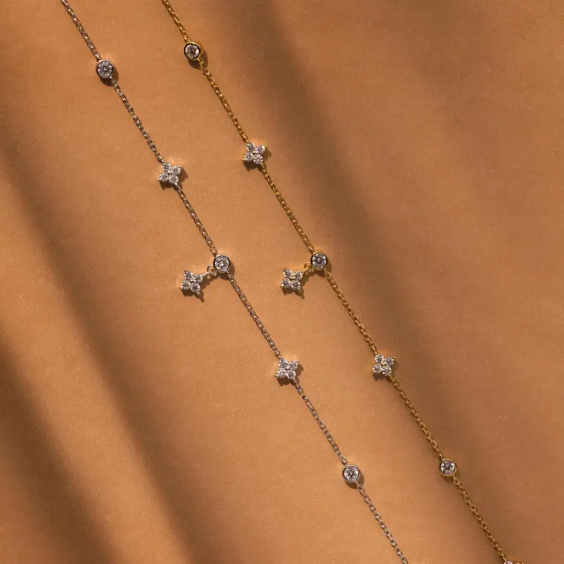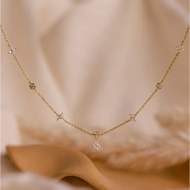 Bloom into elegance with our Ivy Diamond Station Necklace With delicate floral details and sparkling diamond accents, this charming piece adds a subtle yet captivating shimmer to any outfit, making it perfect for weddings, birthdays, or any occasion that calls for a little extra sparkle!