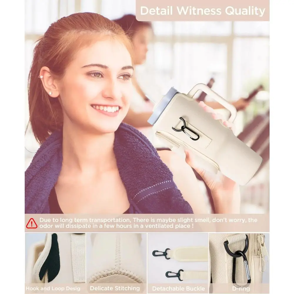 Made of High Quality Neoprene All-round Protection for Stanley Cups 【Perfect for Stanley 40oz Tumbler with Handle】Dabria pink water bottle holder with strap is specially designed for Stanley Quencher H2.0 40 oz and for Stanley Adventure Quencher 40 oz. For stanley accessories 40 OZ provide a snug fit and features fine stitching, making your tumbler pouch even more stylish. The snug fit of the cup makes it easy to keep your for stanley cup in your car cup holder 【Premium Neoprene Material】Still worried about the broken, scratched bottom of your for Stanley water bottle? Or embarrassed by the bottle's noisy clanking on counters or tables? This water bottle holder for stanley accessories 40 OZ is made of high-quality neoprene material, offering excellent waterproofing, shock absorption, softness, lightweight, and comfortable. The tumbler pouch can protect your cup from collision, and scratches, and will not make a noise when placing it on the table! 【Adjustable Shoulder Strap and Multiple Pockets】For Stanley Quencher 40 oz Cup Sleeve comes with a removable and adjustable padded shoulder strap, the shoulder strap can be easily adjusted between 27.5" and 50" to fit a wide range of body shapes. The water bottle holder for stanley accessories 40 oz tumbler is designed with two front pocket designs that provide plenty of room for all your personal belongings such as smartphones, cash, cards,keys,etc 【Bonus with Straw Cover and Carabiner Clip】Coming with a straw cap for stanley cup straw, which can prevent the straw from being contaminated by dust in the air, keeps the straw and cup hygienic, let you drink with confidence anytime. and for stanley cup pouch is equipped with a carabiner clip to carry keychains and other accessories.(Note:Due to long term transportation, There is maybe slight odor, don't worry, the odor will dissipate in a few hours in a ventilated place )