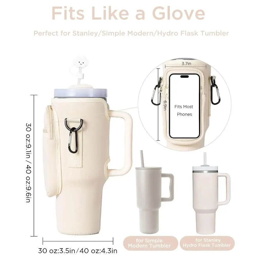 Water Bottle Carrier Bag with Phone Pocket for Stanley 40/30 oz Tumbler, Neoprene Water Bottle Holder Pouch with Adjustable Strap, Straw Cover & Carabiner, Ideal New Year & Valentine's Day Gift