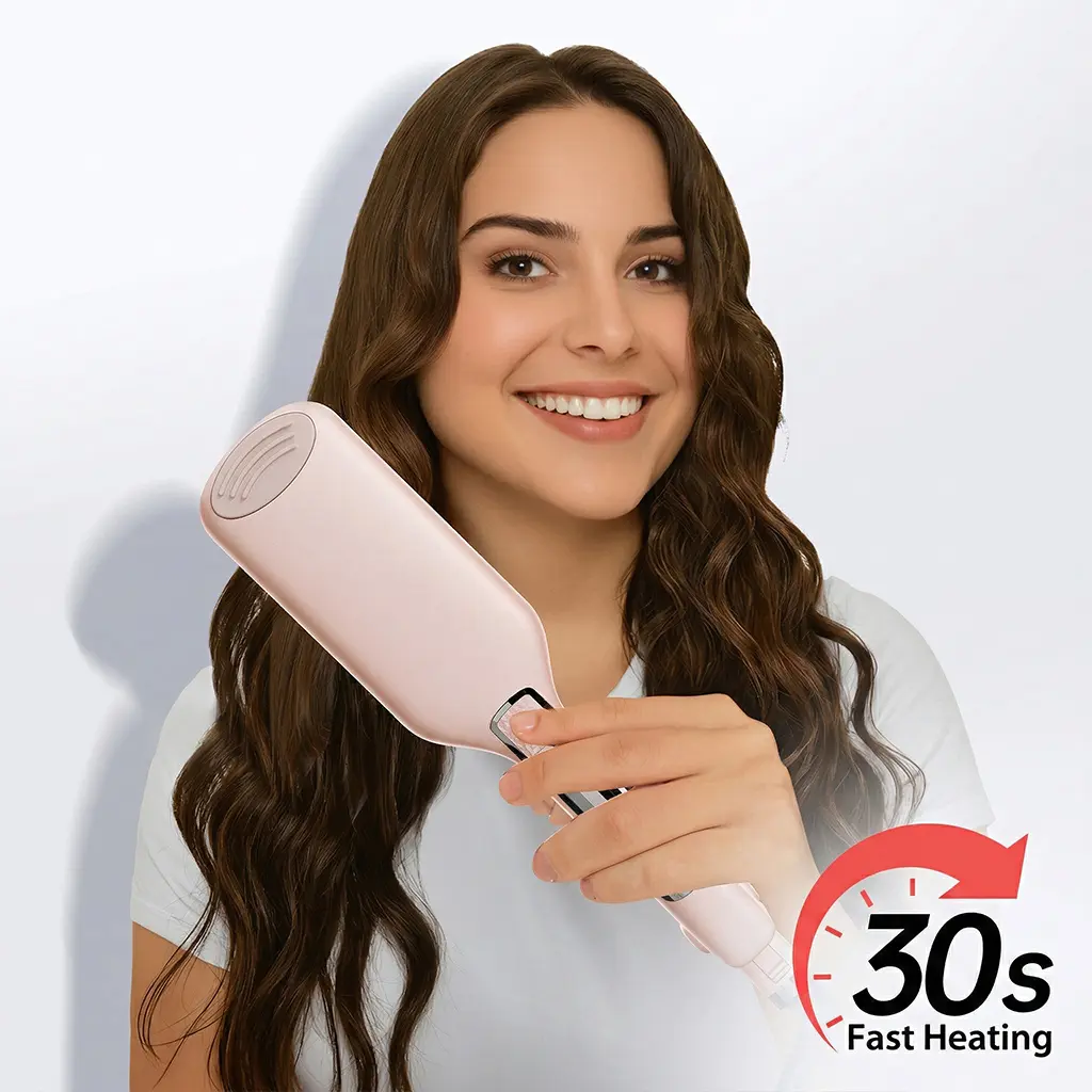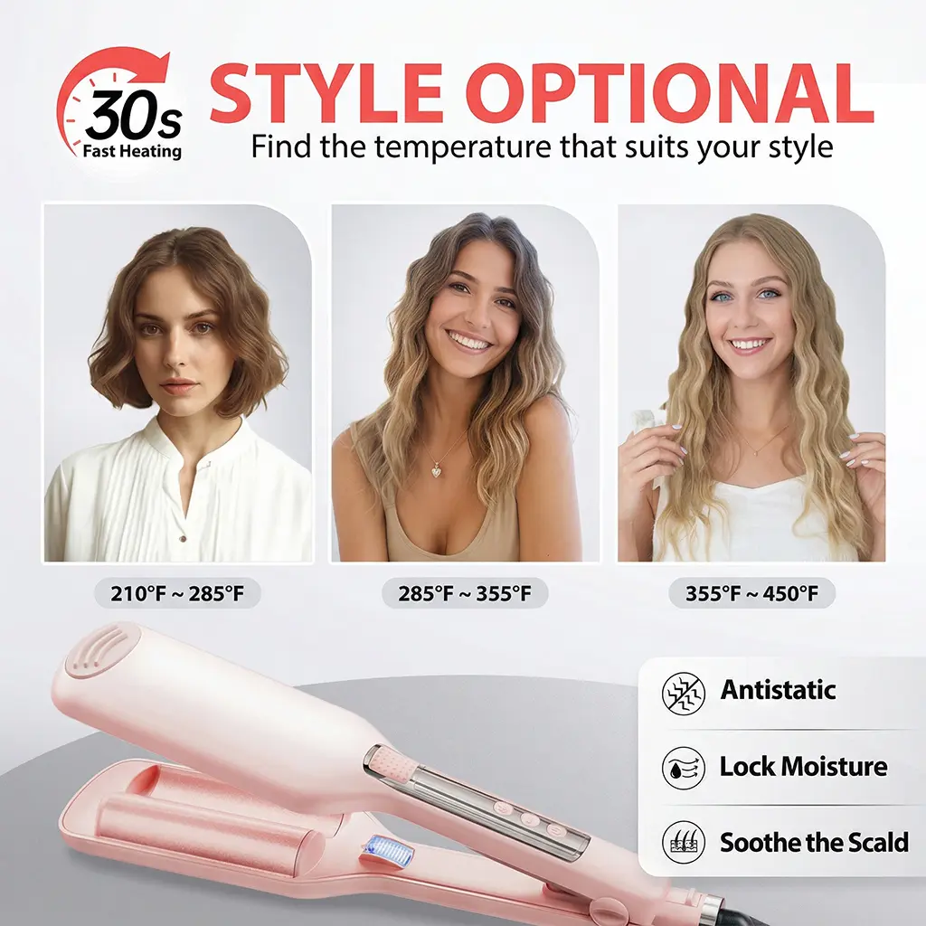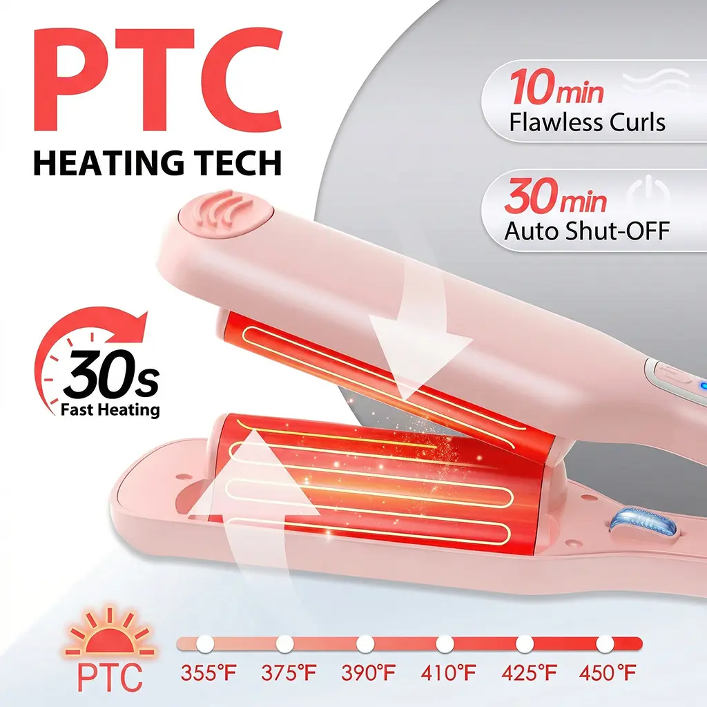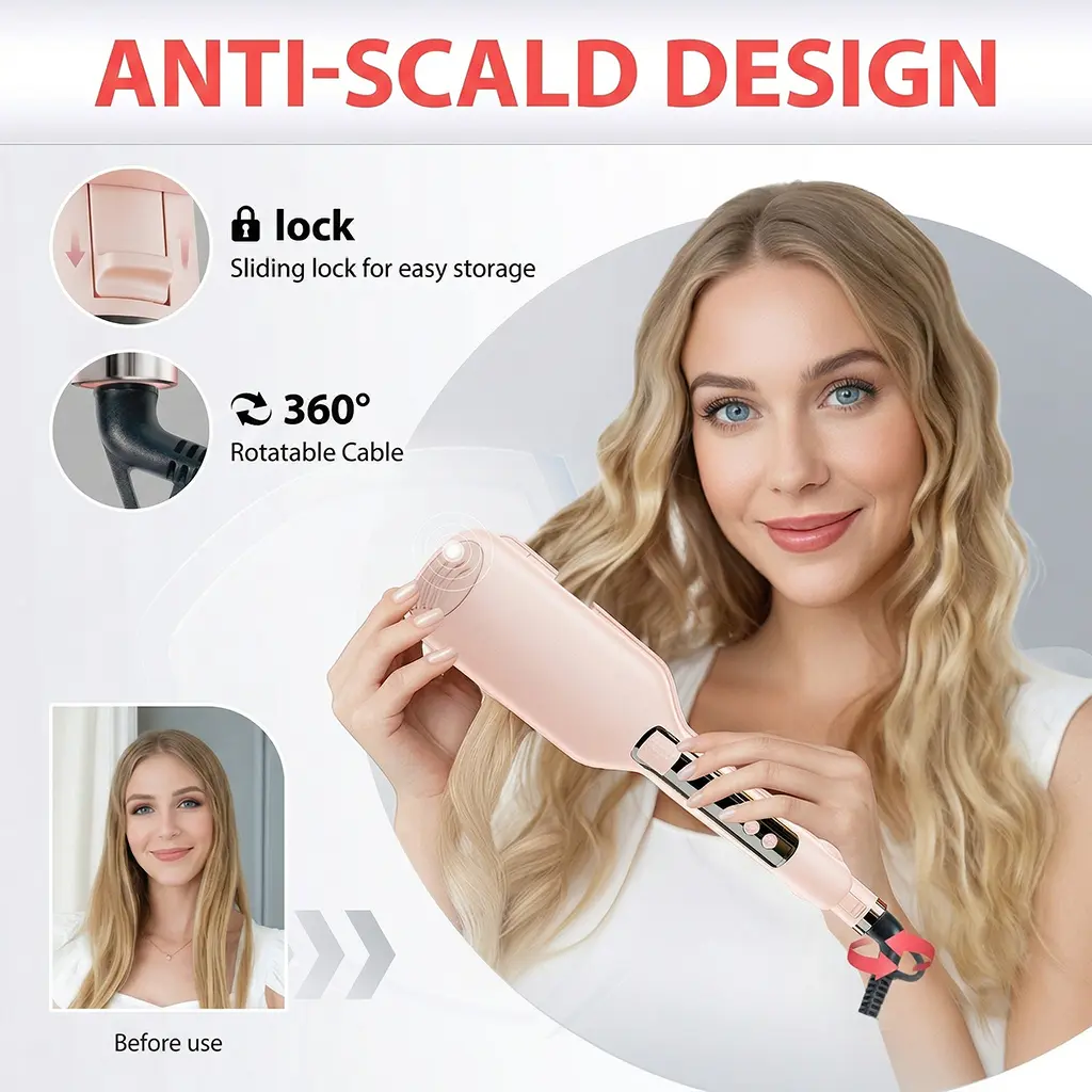 Create smooth, shiny, long-lasting beach waves with this 1.1-inch hair crimper for women. Designed with ionic ceramic technology, fast 30-second heating, adjustable temperature control, and an anti-scald outer shell, it helps reduce frizz while styling. The locking design, 360° swivel cord, and automatic shut-off make it practical for daily use at home.