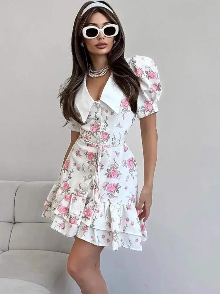 A defined waist, airy flutter hem, and oversized collar work together to give it structure without feeling stiff. The puff sleeves add just enough volume, balanced by a button-down front that keeps everything looking intentional.
