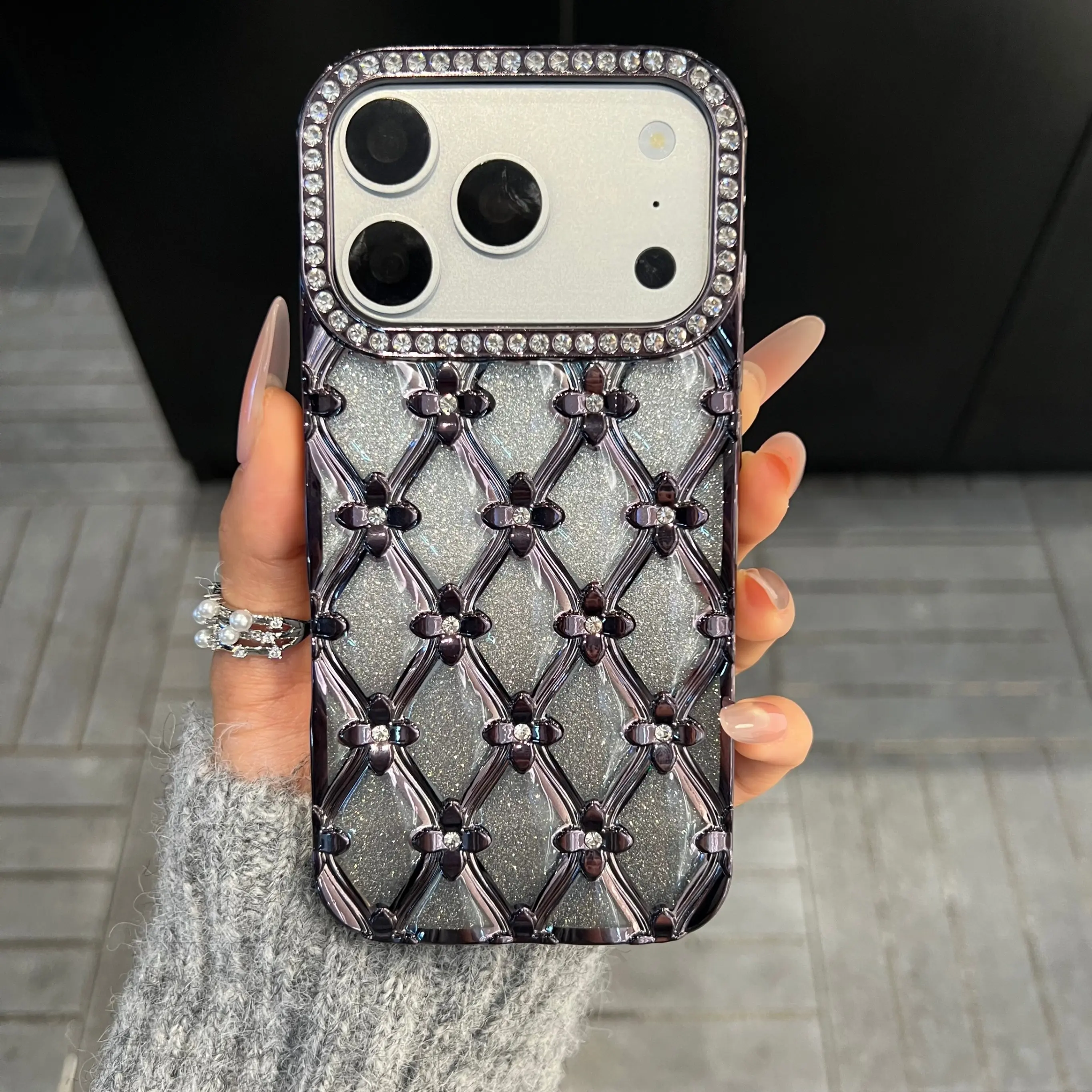 Silver Plated Four-Corner Shockproof Phone Case for iPhone 17 Pro Max 16 15 Pro Max 14 Plus 13 12, Minimalist Pearlescent White & Cement Gray Silicone Cover, Trendy Luxury for Women