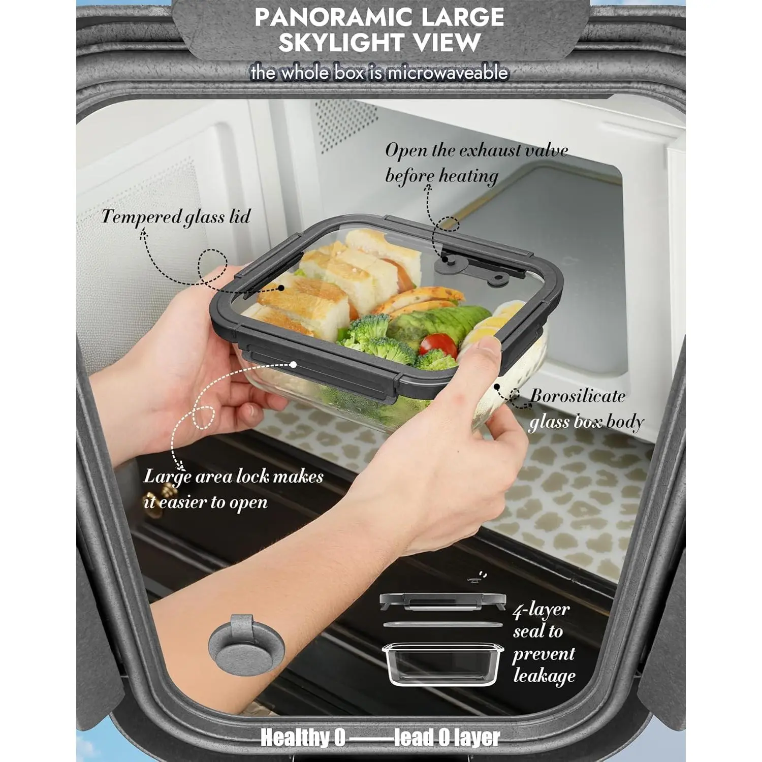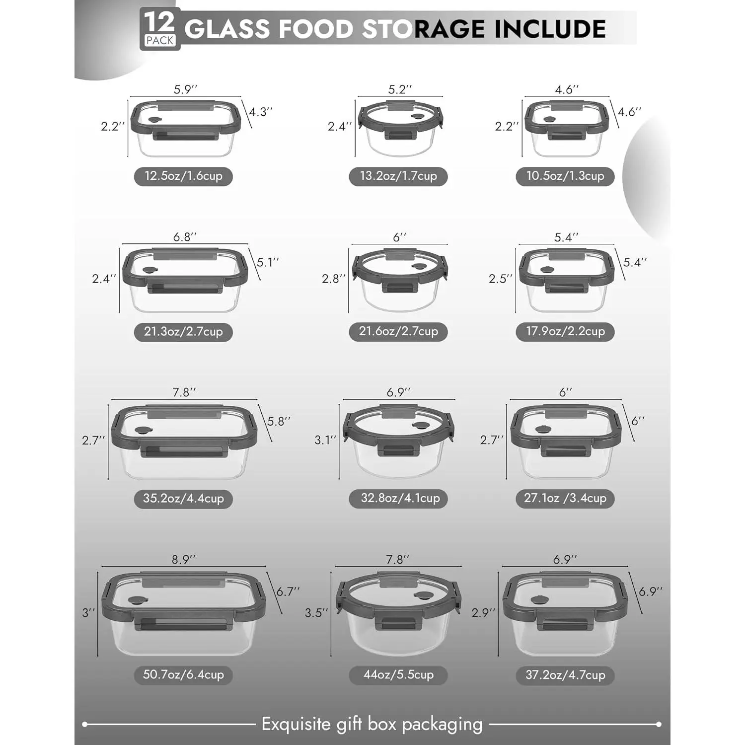 12-Pack Glass Containers with Tempered Lids – Borosilicate, Oven-Safe(-4°F~950°F), Airtight, BPA-Free, Multi-Size for Meal Prep, Dishwasher Safe (Gray)