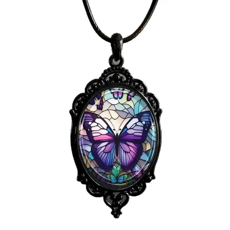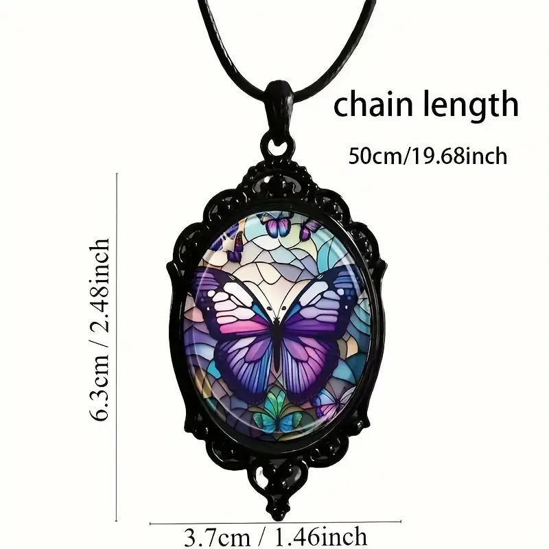 Elevate your edgy style with this stunning gothic stained glass butterfly necklace! Crafted from durable black alloy with an ornate oval frame, it features a vibrant purple butterfly in a Tiffany-style stained glass design, set in a scratch-resistant glass cabochon. The 50cm (19.68") black leather cord is comfortable for all-day wear, perfect for goth, y2k, vintage, and boho outfits. A statement piece for butterfly lovers and alternative fashion enthusiasts.