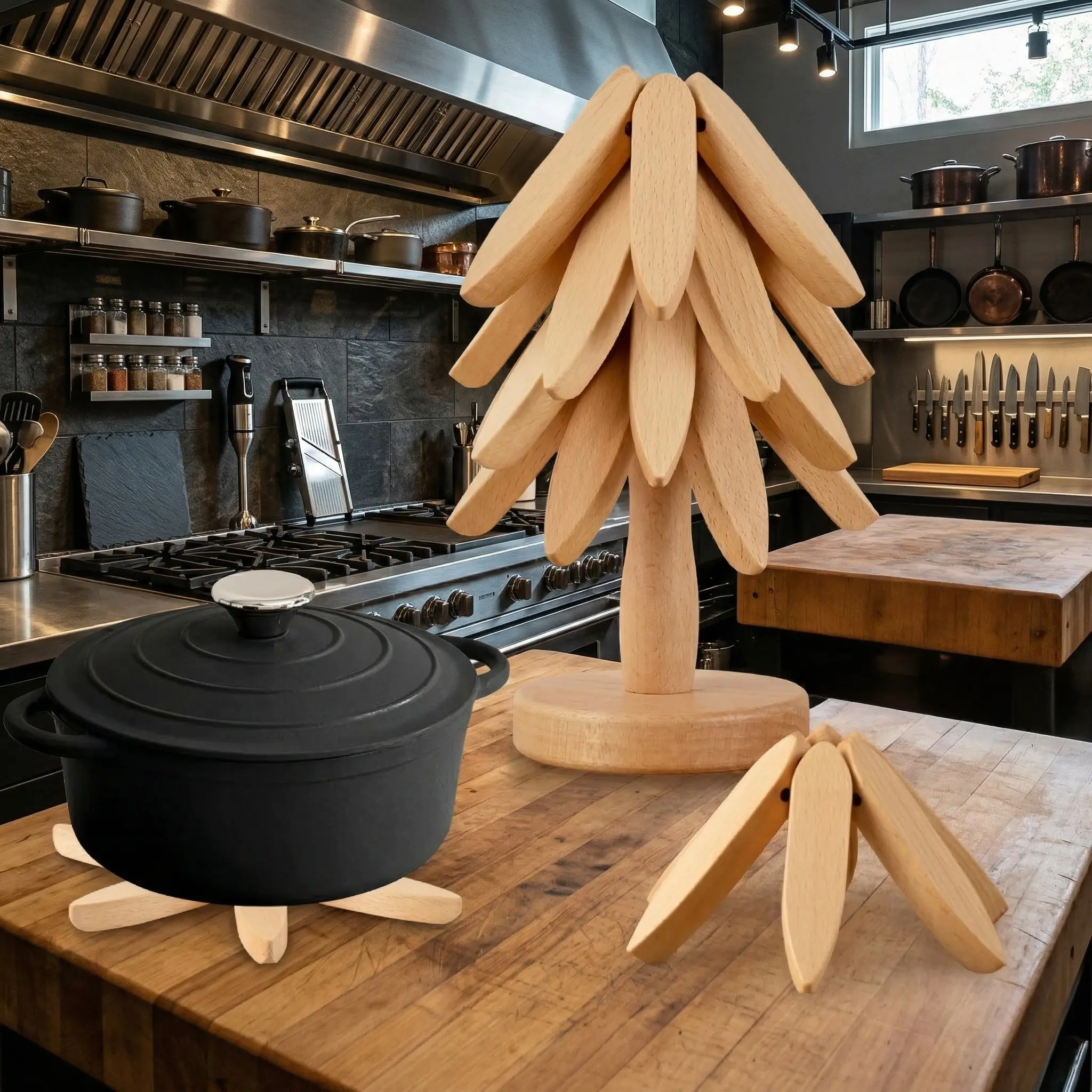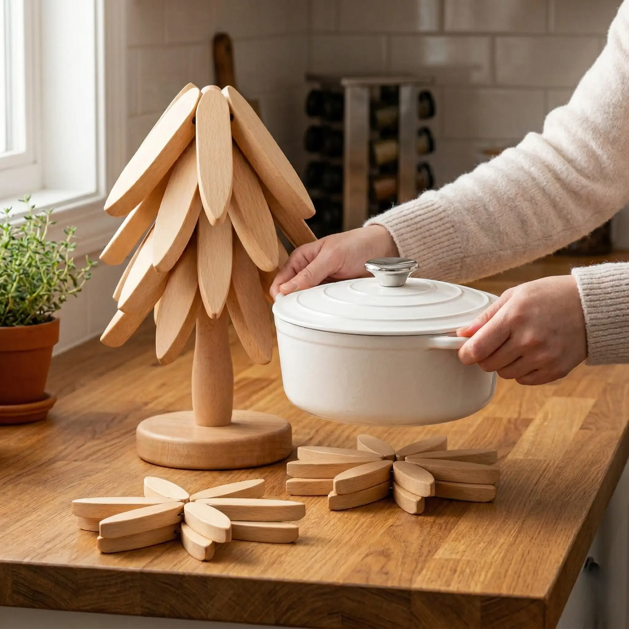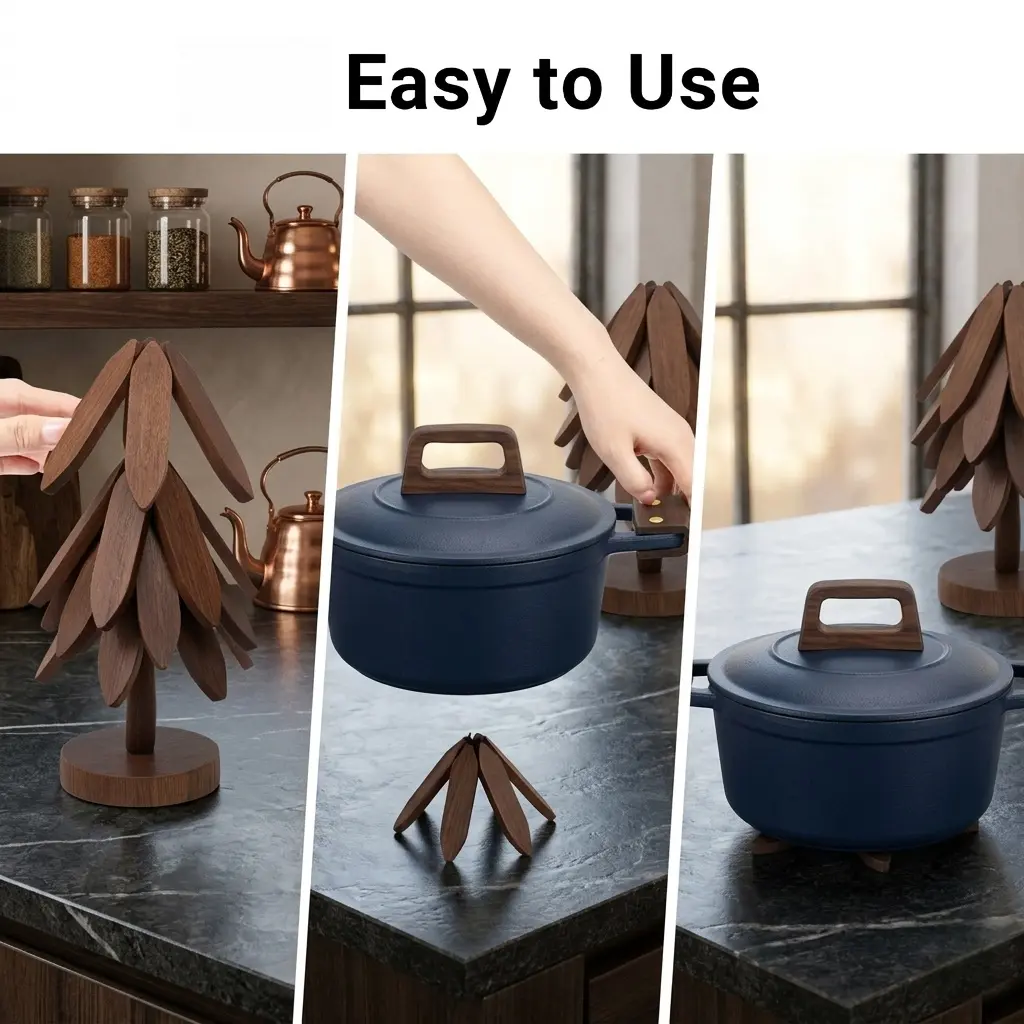 Why settle for boring hot pads when you can have a piece of art? Our Tree-Shaped Wooden Trivet Set includes 4 premium foldable mats that stack into a beautiful decorative tree. It’s the perfect blend of modern minimalism and rustic charm for your kitchen.