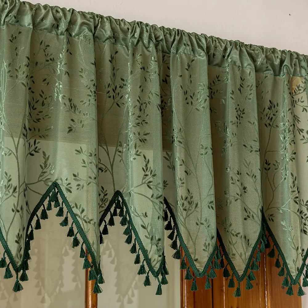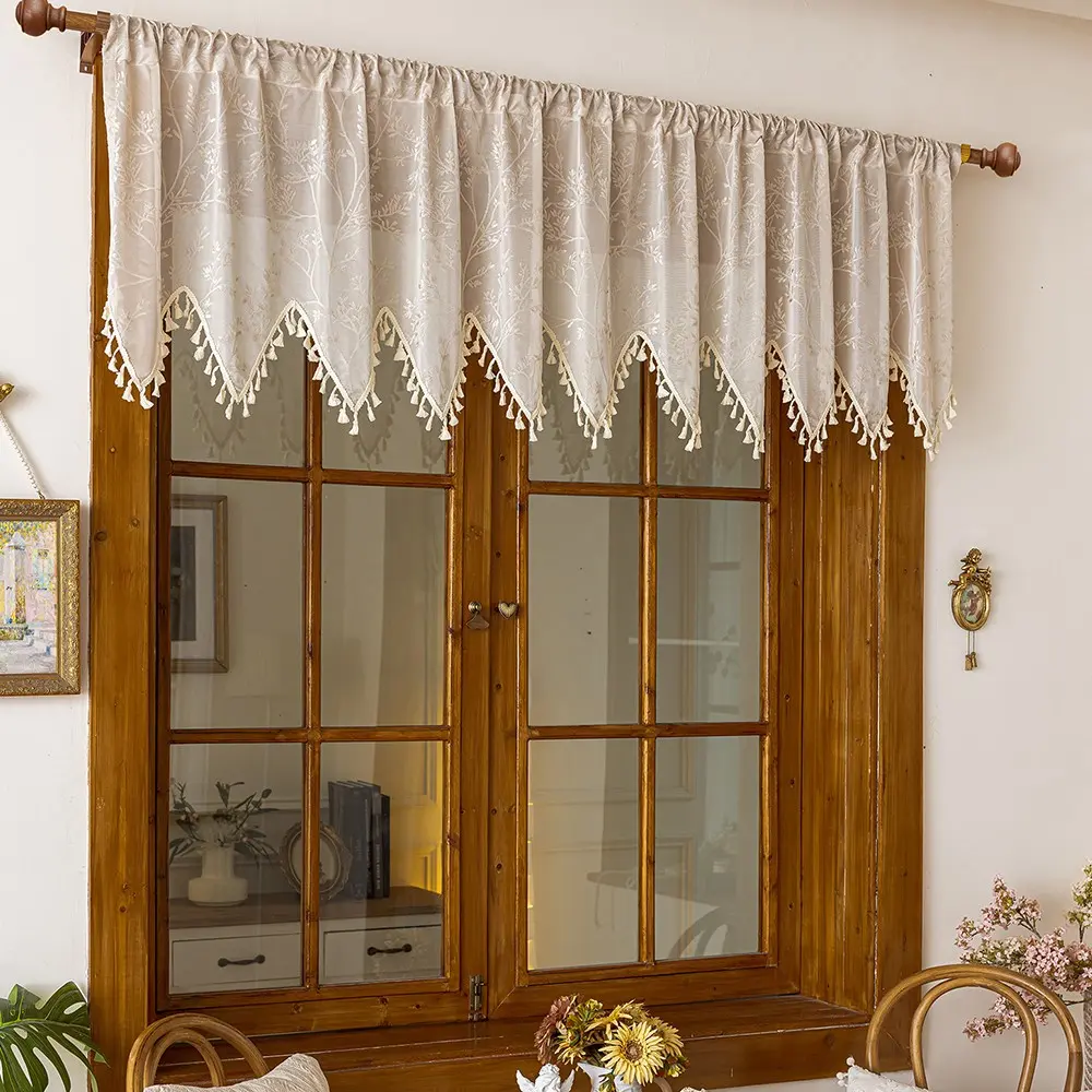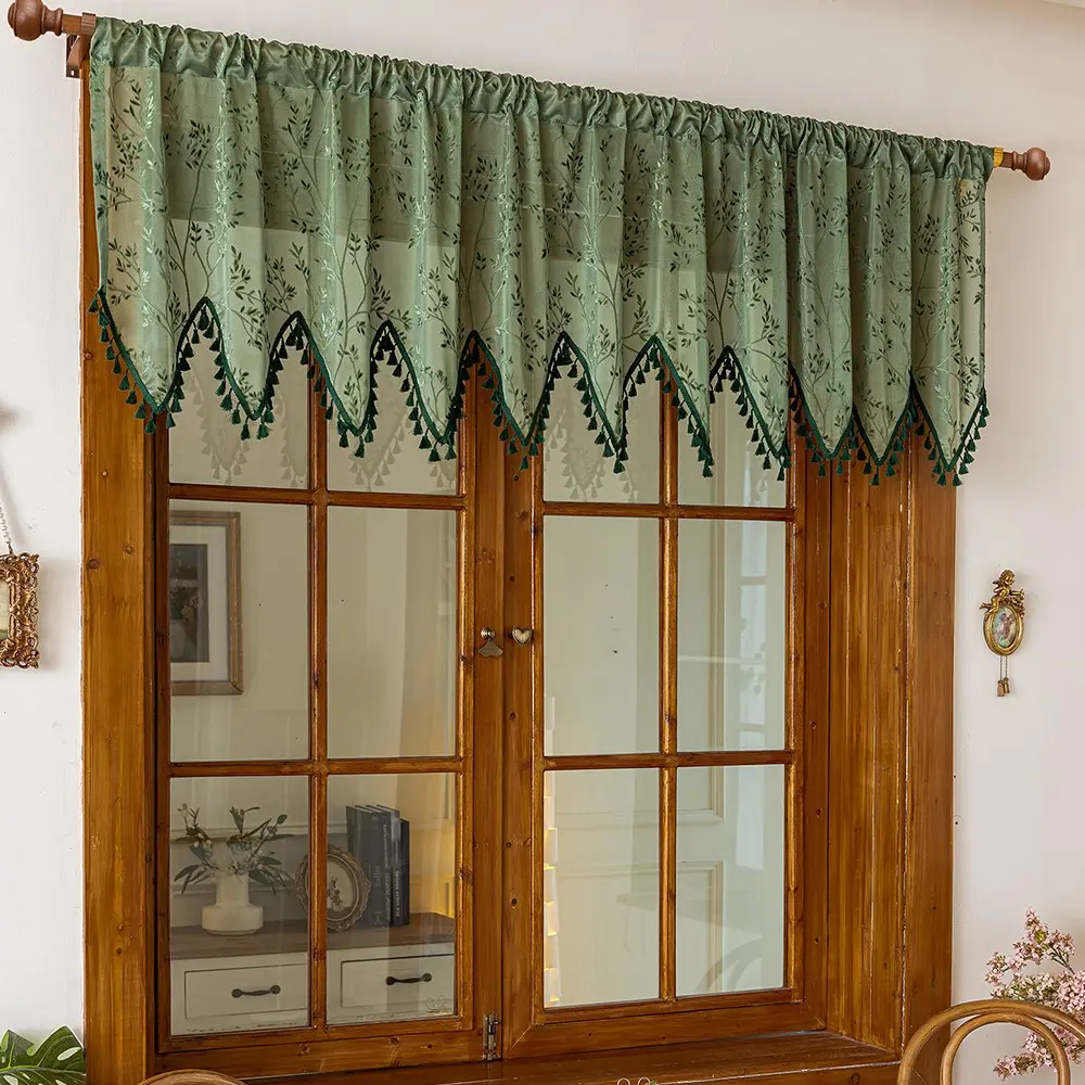 5. 1pc American Country Leaf Embroidered Triangle Fringe Half Curtain, Vintage Coffee Shop Curtain, Kitchen Window Decor, Retro Style