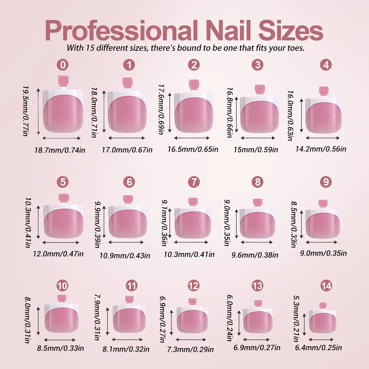 15 Precise Sizes to Fit Every Foot Shape: Includes 15 distinct specifications ranging from size 0 to 14 (covering widths from 5.3mm to 19.5mm). The generous pack contains 150 pieces per box, ensuring a perfect fit for various toes—from the big toe to the pinky—without the need for trimming.