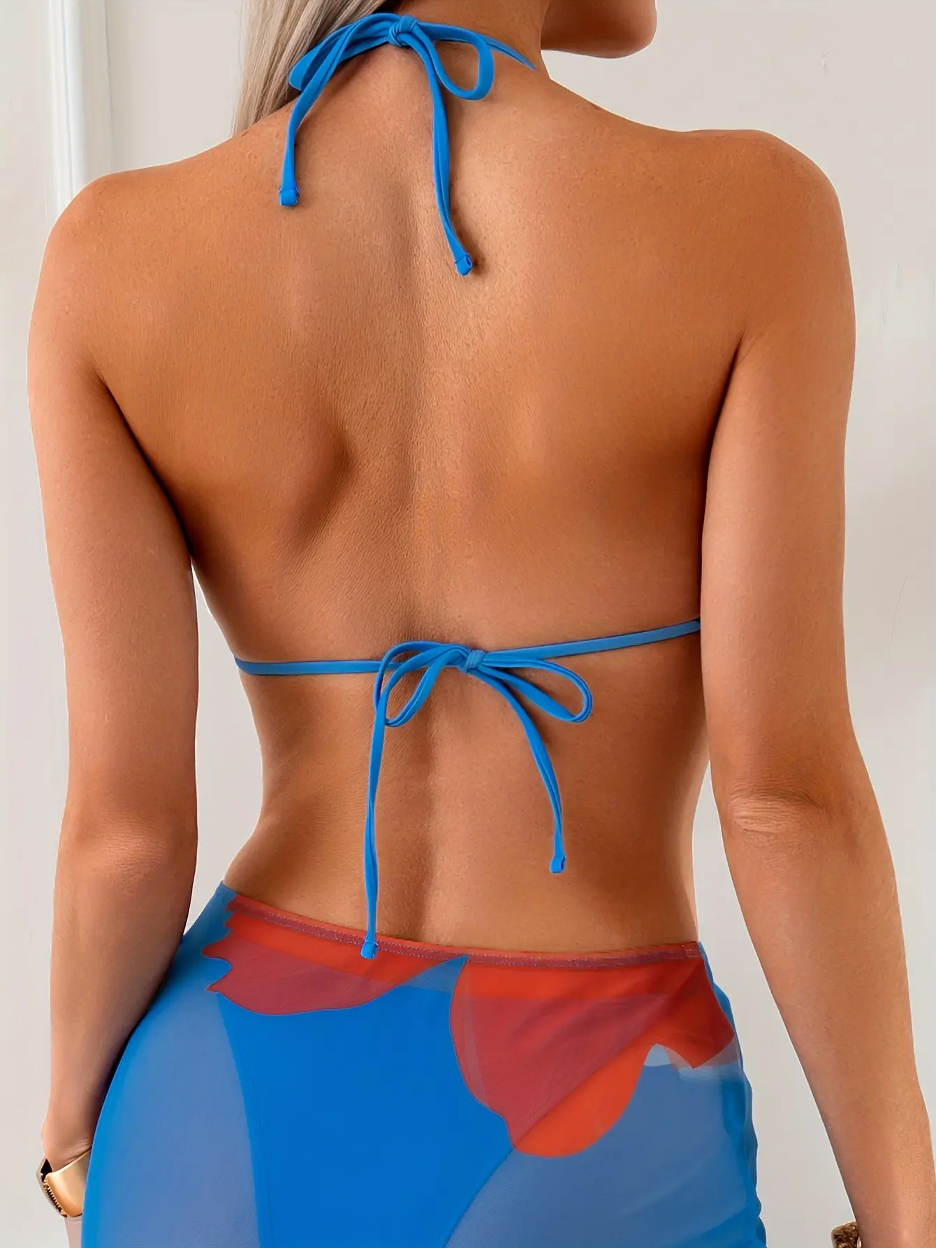 This 3 piece bikini set combines bold, eye-catching design with practical functionality. The adjustable halter neck, side drawstring ties, and sheer mesh cover-up make it suitable for a wide range of body types and personal style preferences, while the timeless blue and red flower print creates a summer-ready aesthetic that never goes out of style. Whether you are lounging by the pool, walking the beach, or enjoying water sports, this bikini set will keep you looking and feeling your best.