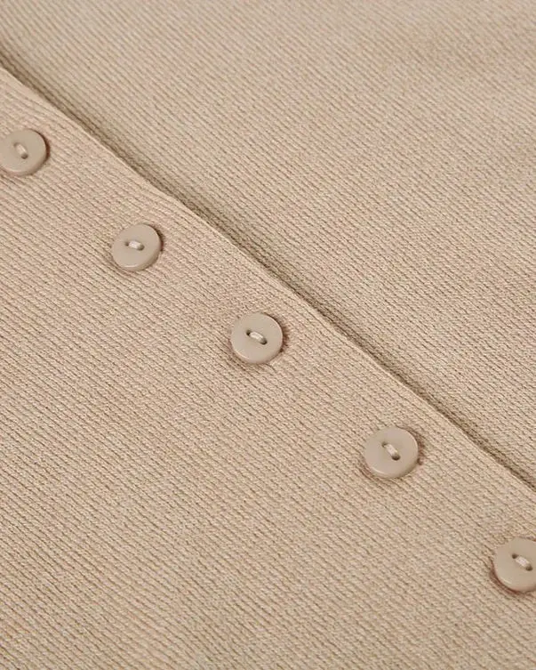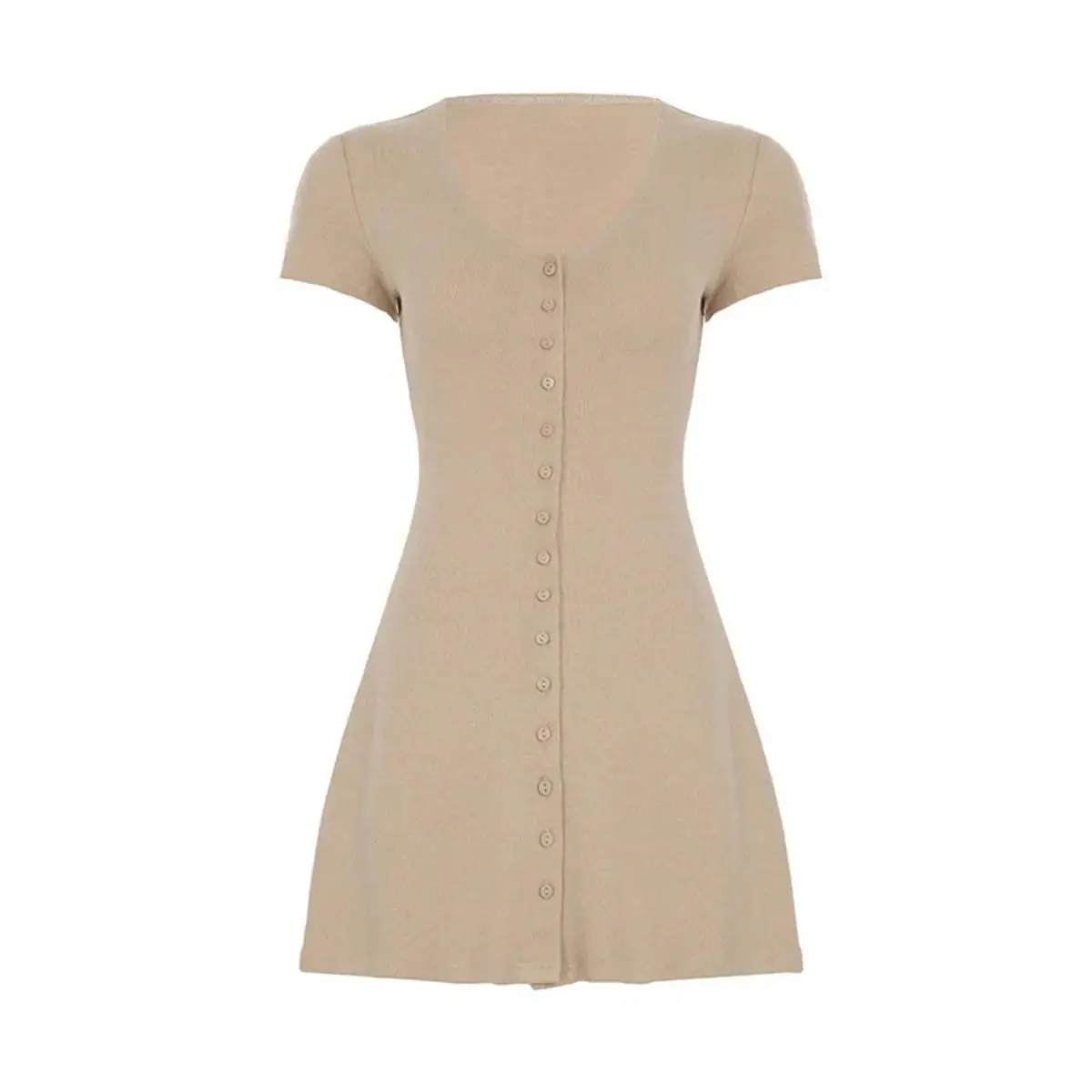 Cut from a soft, breathable knit with a natural beige texture, it skims the body in all the right places without feeling restrictive. The silhouette follows your shape through the waist before easing out into a subtle A-line, giving it that easy movement that makes short dresses actually wearable, not just photogenic.