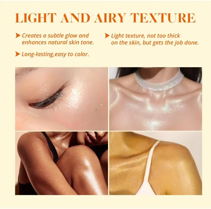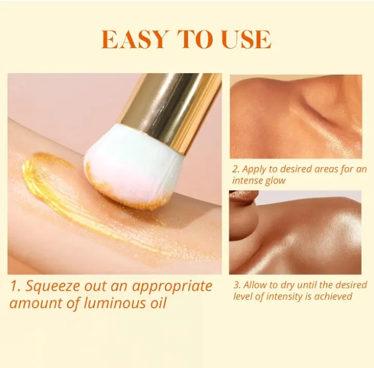 ·Let your face and body shine: This liquid shimmer body oil doubles as a universal highlighter for face and body, blending seamlessly to enhance facial radiance, add a lustrous glow, and impart a sun-kissed shimmer
