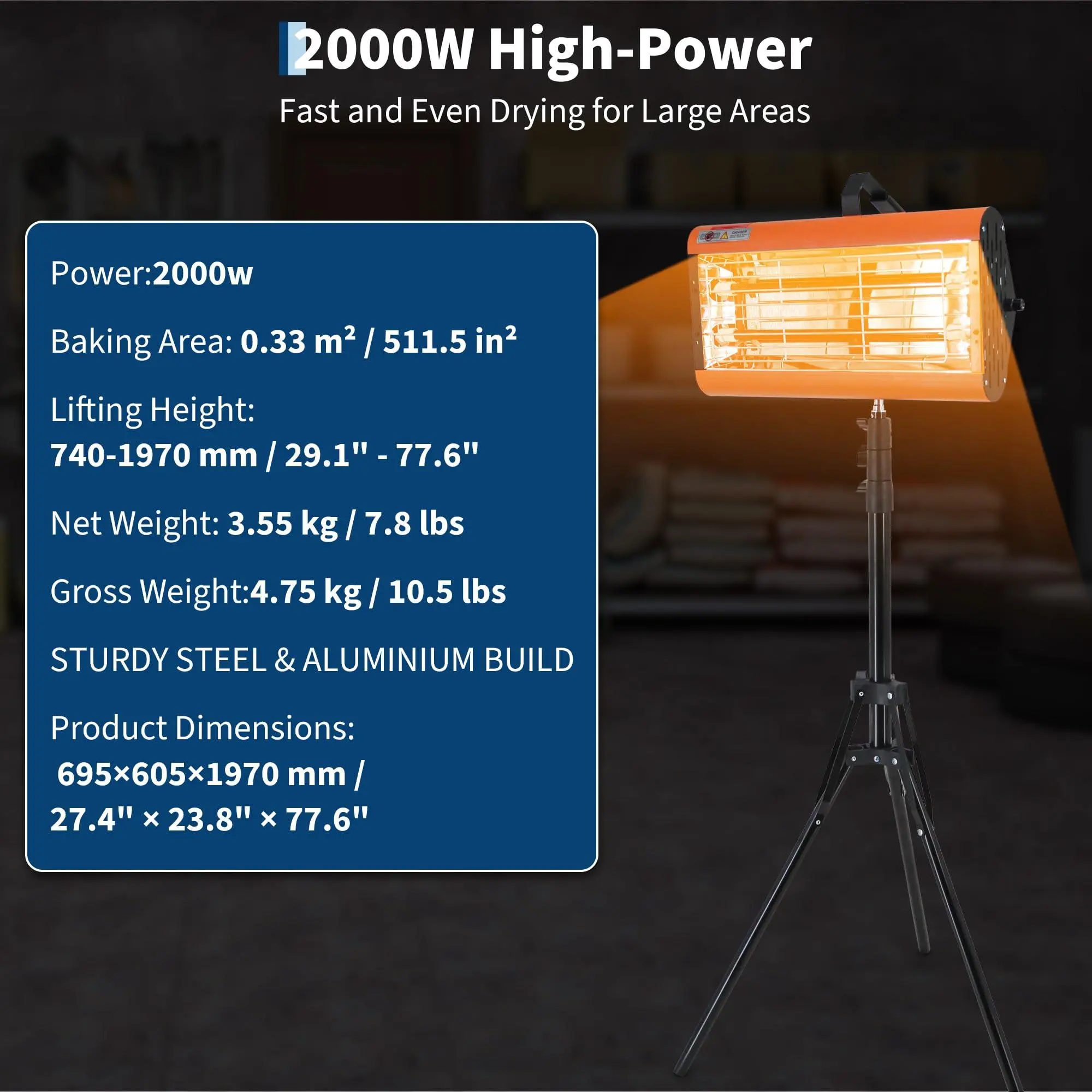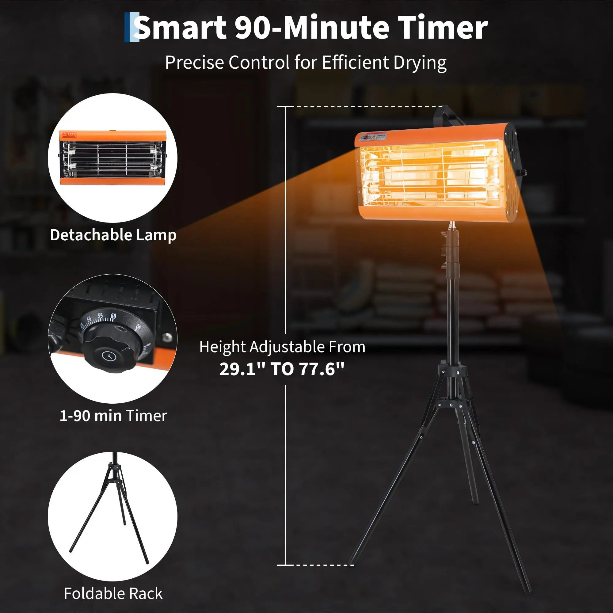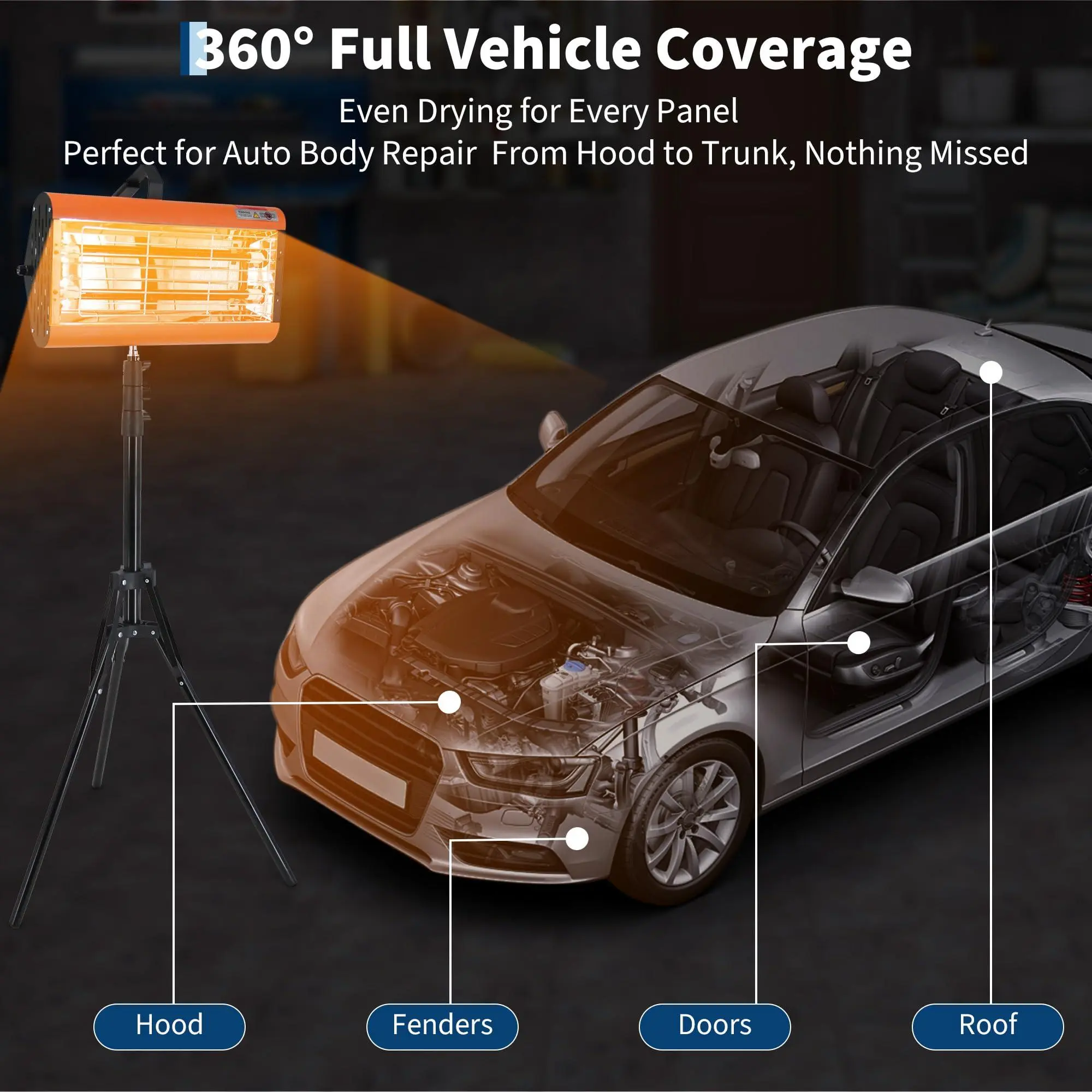 Dual-Use Flexibility - Unlock ultimate versatility with our Infrared Paint Curing Lamp, designed for handheld precision or fixed stand operation. Whether you’re spot-repairing a fender or baking a full panel, this Infrared Paint Curing Lamp adapts instantly. The foldable stand, adjustable height, and 360° wheels let you tackle projects anywhere—garage, roadside, or shop.