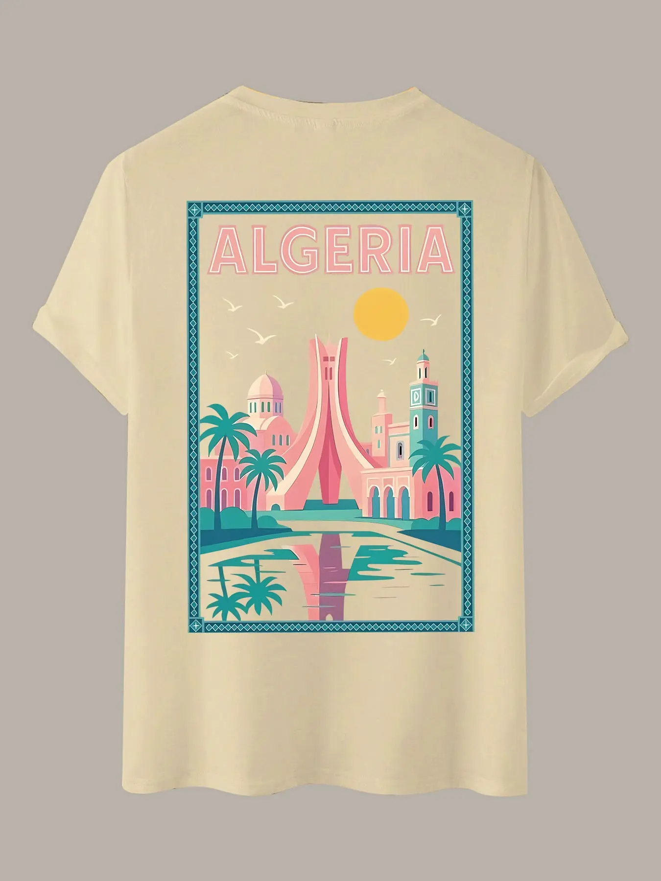 Algerian Cityscape Vintage Print Cotton Short Sleeve T-Shirt, 2026 Summer American Retro Oversize Unisex Top, Versatile Fashion Apparel
